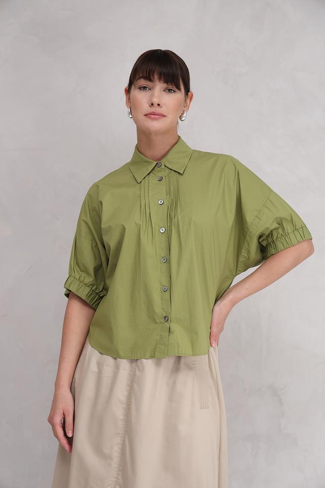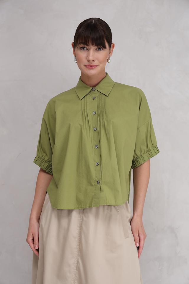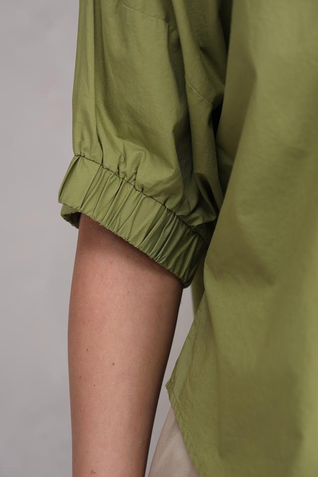 Оливковая блуза от Repeat с короткими рукавами-фонариками и воротником-стойкой. Изготовлена из 100% хлопка, обеспечивающего комфорт и воздухопроницаемость. Стильный и универсальный выбор для создания повседневных образов. Состав: хлопок 100%