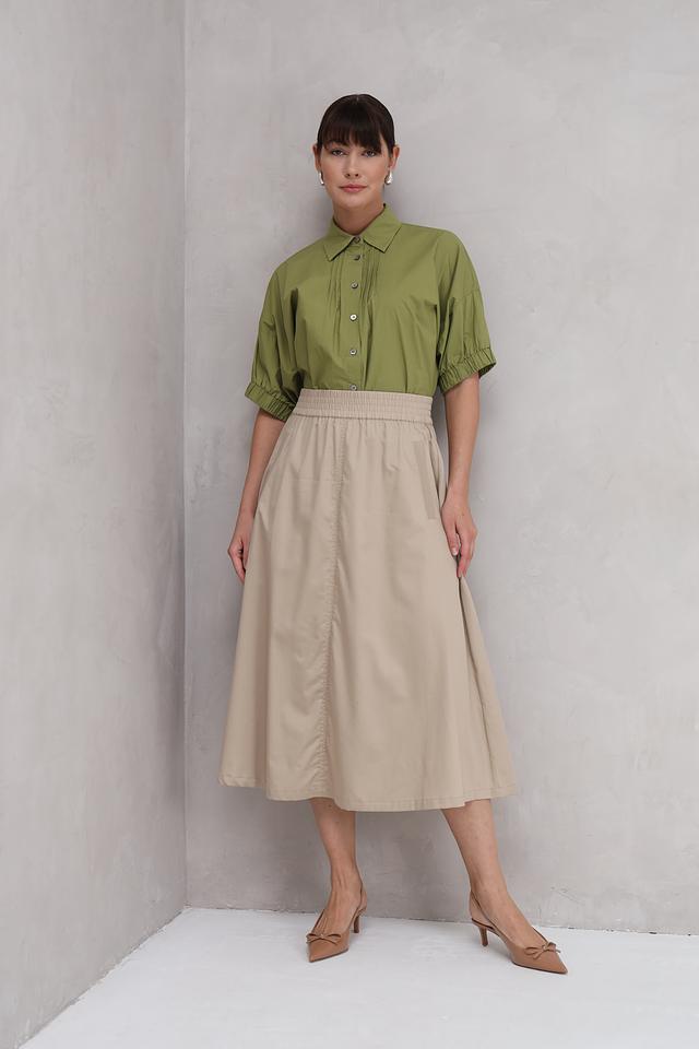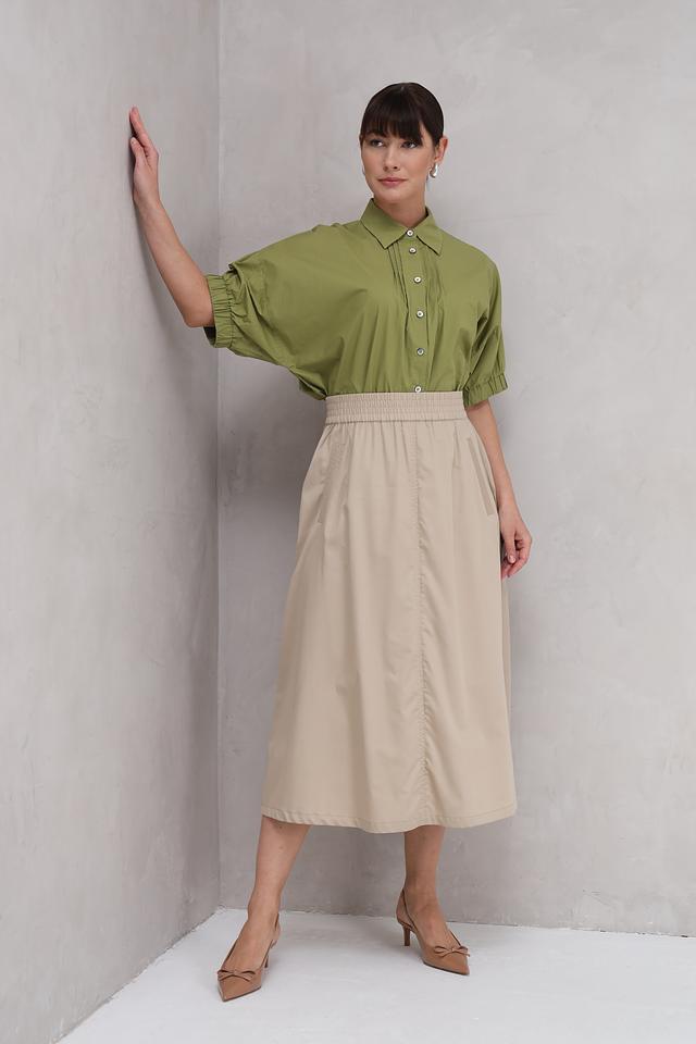 Оливковый цвет блузы делает ее универсальной и легко сочетаемой с различными элементами одежды. Она прекрасно подойдет для создания как повседневных, так и более нарядных образов. Блузу можно носить с юбками, брюками или джинсами.