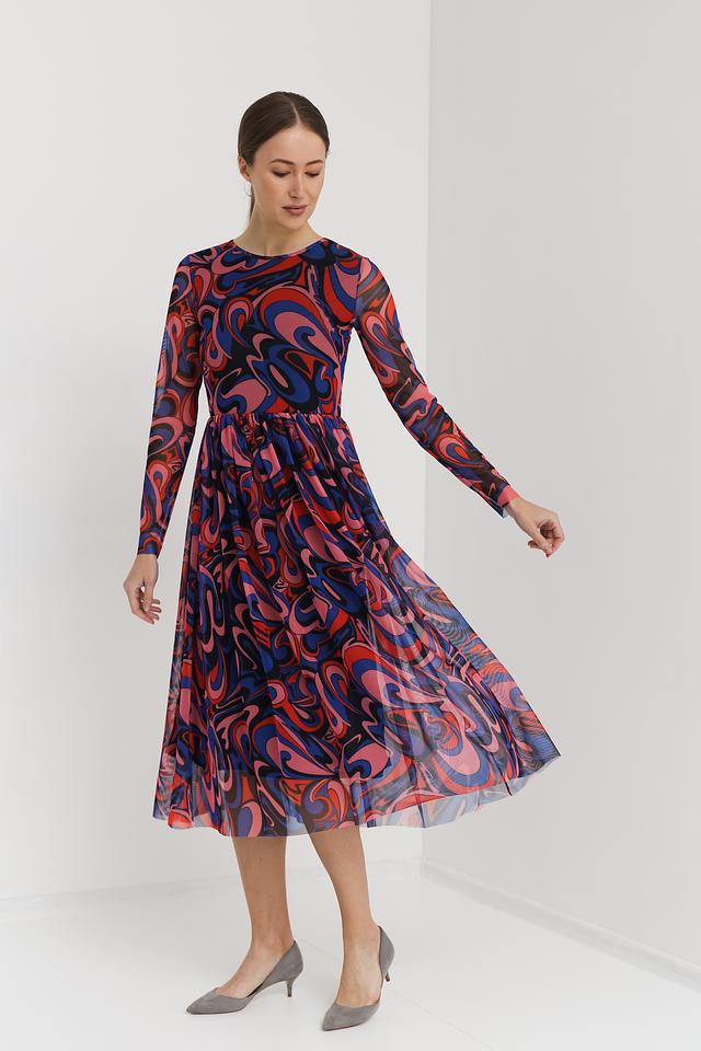 Модель имеет длинные рукава и круглый вырез горловины. Особое внимание привлекает яркий абстрактный принт, выполненный в синих, красных и розовых тонах. Плиссированная юбка из полупрозрачной ткани добавляет образу легкости и воздушности.