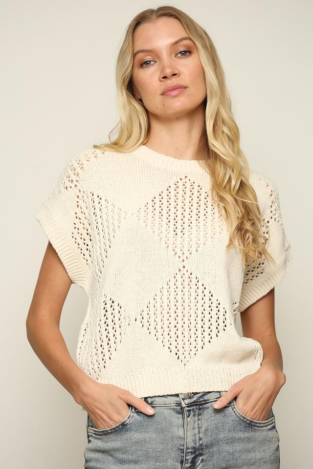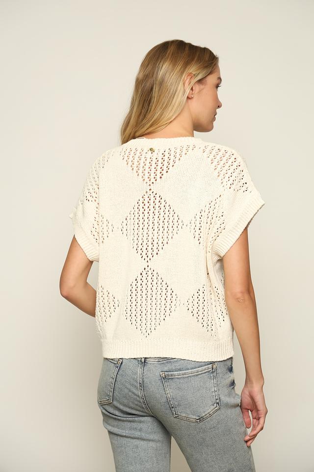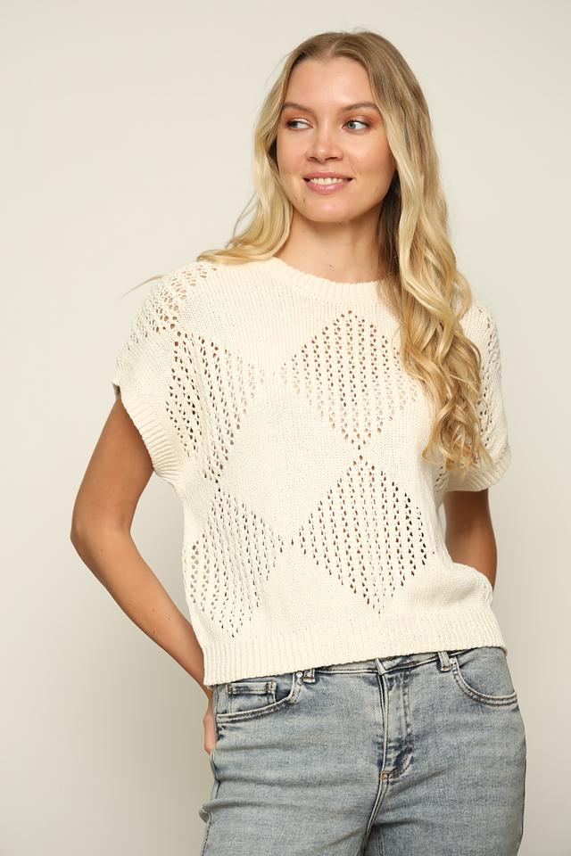 Бежевый пуловер от Rich and Royal с коротким рукавом и ажурной вязкой. Модель выполнена из мягкого хлопка с добавлением полиэстера и эластана, обеспечивающих комфорт и хорошую посадку. Состав: хлопок 75%, полиэстер 20%, эластан 5%