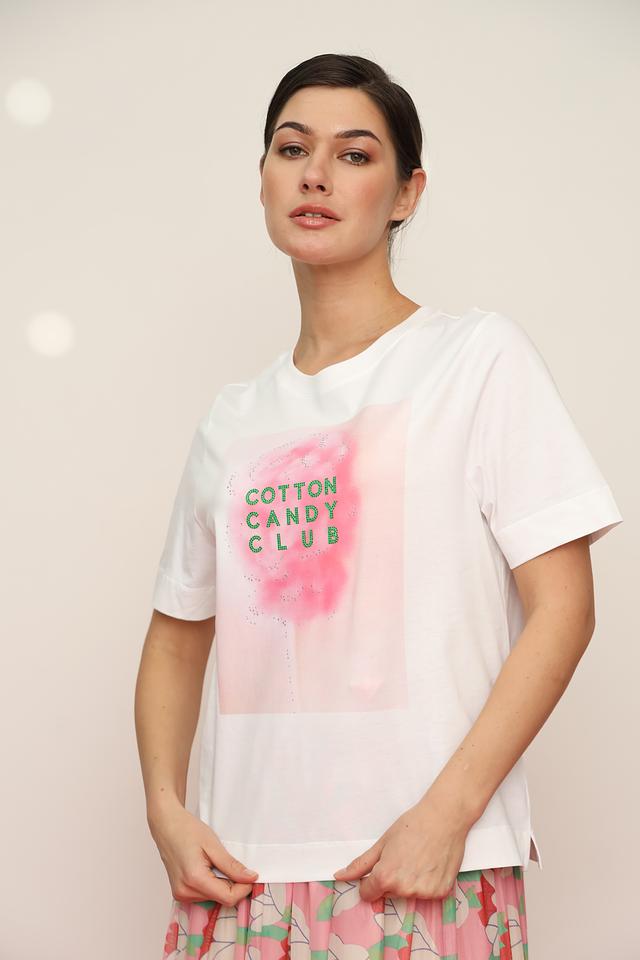 Особенностью данной модели является яркий принт "Cotton Candy Club", выполненный в нежных розовых и зелёных тонах. Принт добавляет игривости и оригинальности. Крой футболки свободный, что обеспечивает свободу движений и позволяет сочетать её с различными элементами гардероба.
