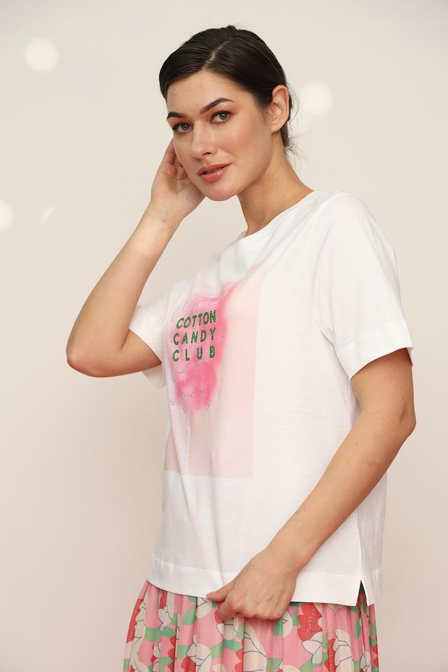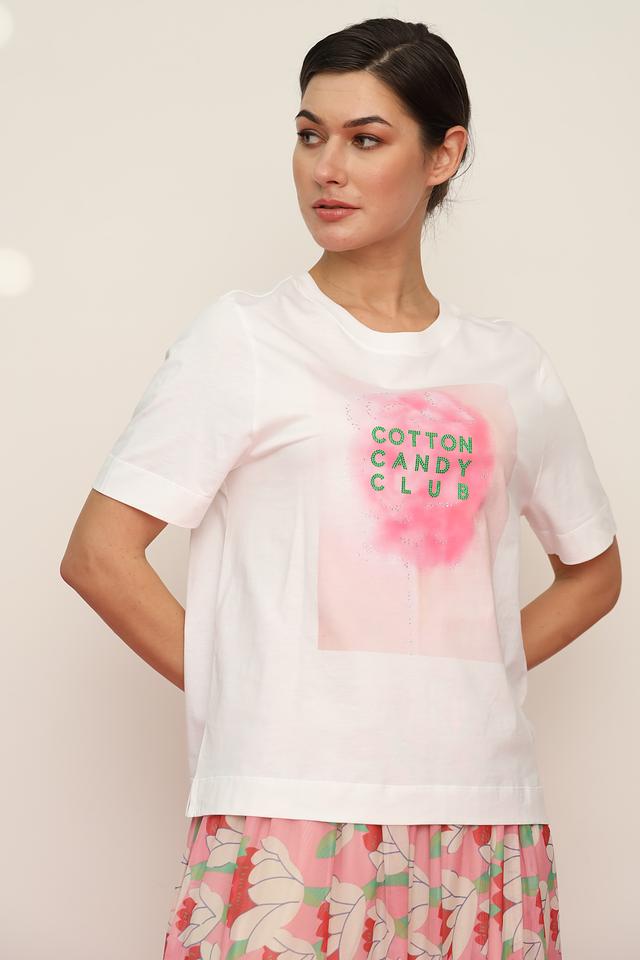Белая футболка Rich and Royal с ярким принтом "Cotton Candy Club" станет стильным дополнением к вашему образу. Модель выполнена из 100% хлопка, обеспечивая комфорт в носке. Состав: хлопок 100%