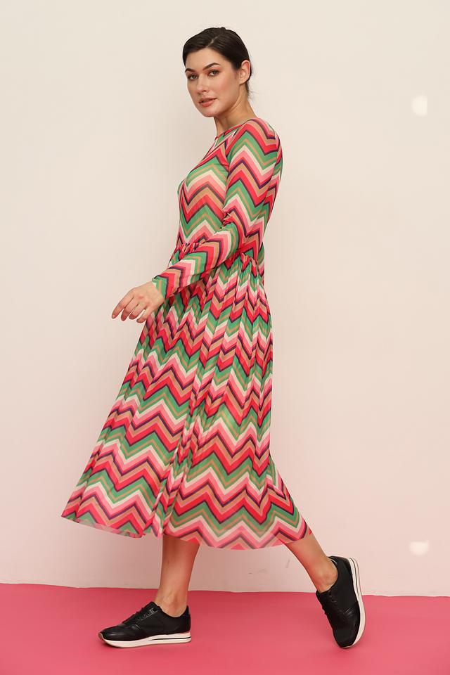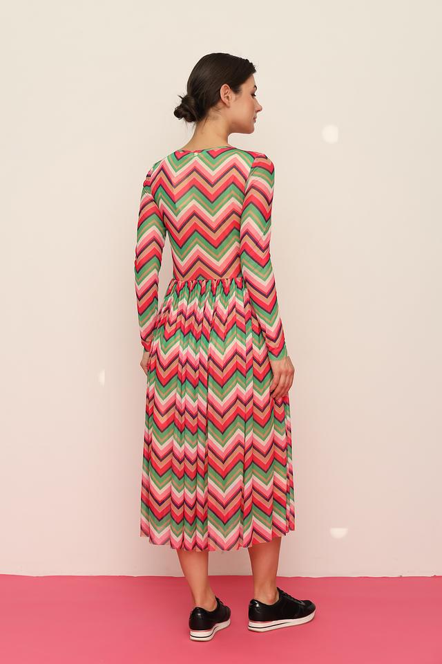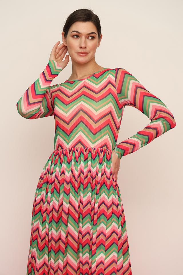 Платье имеет приталенный силуэт, который подчеркивает фигуру, и длинные рукава. Особое внимание привлекает яркий узор в полоску, выполненный в сочетании красного, розового и зеленого цветов. Юбка-плиссе придает платью легкость и динамичность.