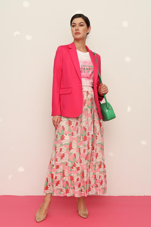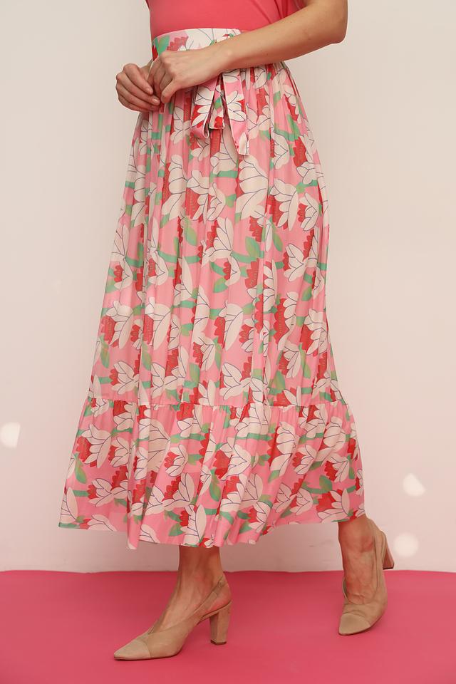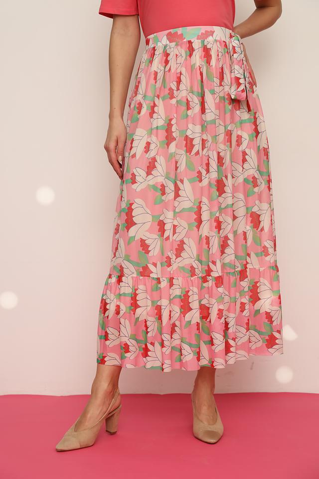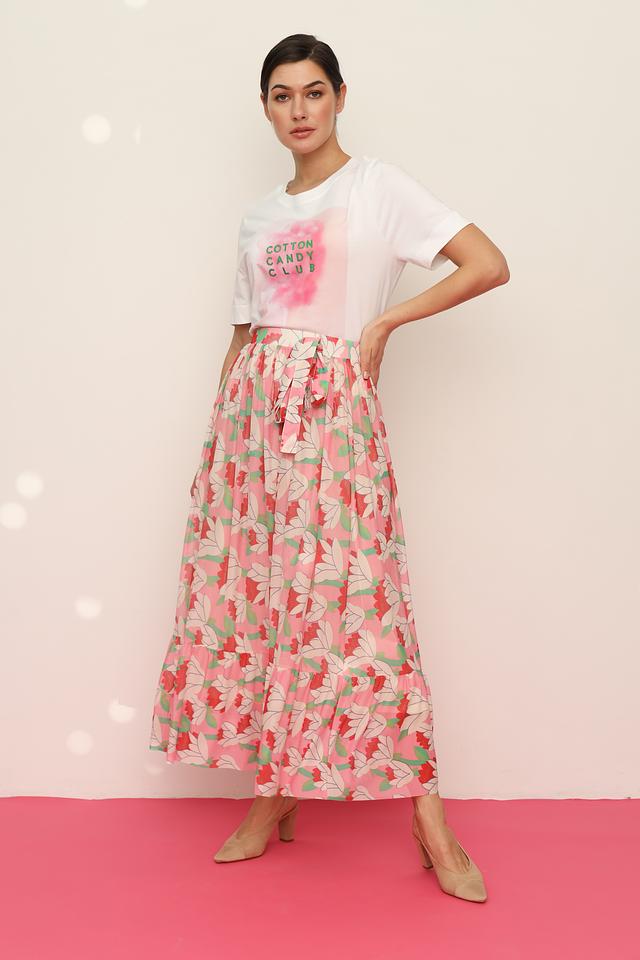 Основной цвет юбки – нежно-розовый, а яркий цветочный принт добавляет ей игривости и свежести. Эта юбка станет отличным выбором для летних прогулок, вечеринок или повседневной носки. Она легко сочетается с различными топами и обувью, позволяя создавать разнообразные образы.