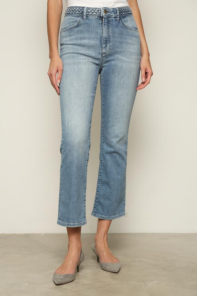 Джинсы имеют высокую посадку, которая подчеркивает талию и визуально удлиняет ноги. Укороченный прямой силуэт делает их актуальными и современными. Ткань состоит из 97% хлопка и 3% эластана, что обеспечивает мягкость, приятные тактильные ощущения и небольшую эластичность.