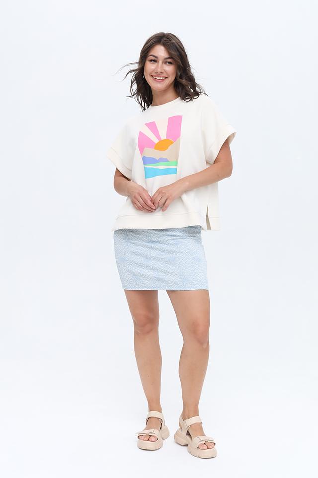 Женская футболка Rich and Royal кремового цвета с ярким принтом в виде восхода солнца. Изготовлена из мягкого и приятного к телу модала с добавлением полиэстера и эластана, обеспечивающих комфорт и хорошую посадку. Состав: модал 51%, полиэстер 43%, эластан 6%