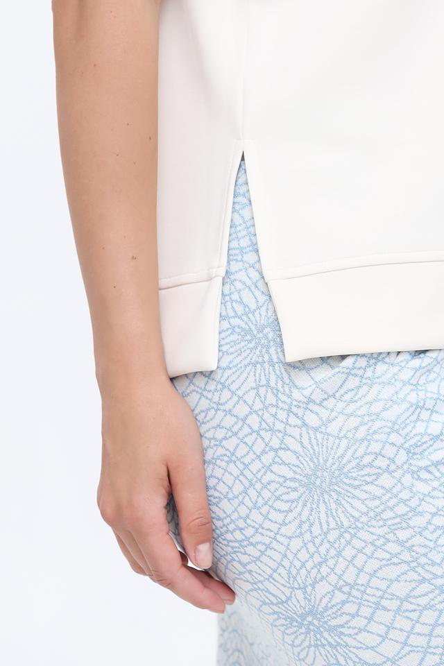 Футболка имеет свободный крой и короткие рукава с манжетами, что обеспечивает комфорт в носке. Модель изготовлена из высококачественного модала, полиэстера и эластана, которые приятны к телу и хорошо держат форму.