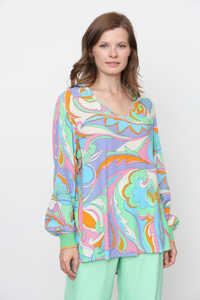 Особенностью этой блузы является ее уникальный принт – яркий и красочный абстрактный узор, выполненный в различных оттенках. Эта блуза идеально подойдет для создания стильного и запоминающегося образа, который подчеркнет вашу индивидуальность.