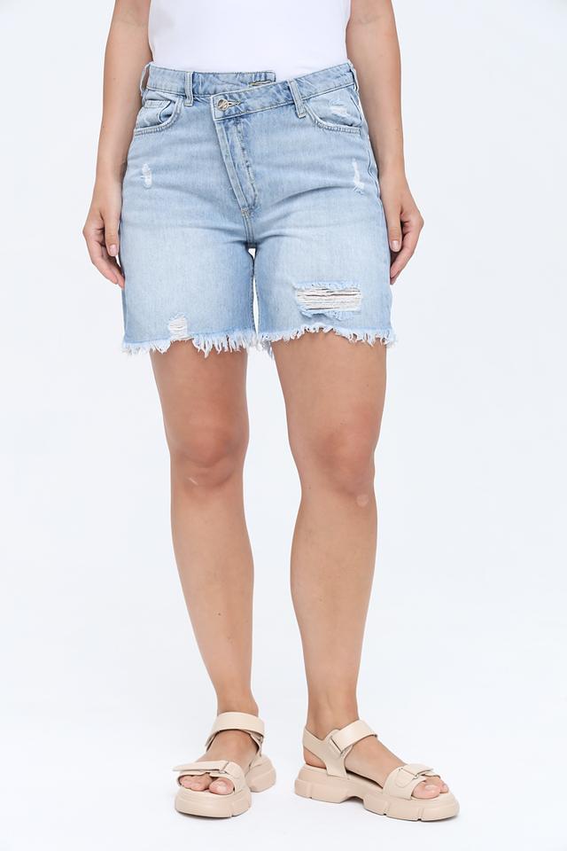 Шорты отличаются оригинальным дизайном с эффектом потертости и рваными деталями, что придает им непринужденный и современный вид. Высокая посадка подчеркивает талию и создает силуэт. Застежка на молнию и пуговицу обеспечивает надежную фиксацию.