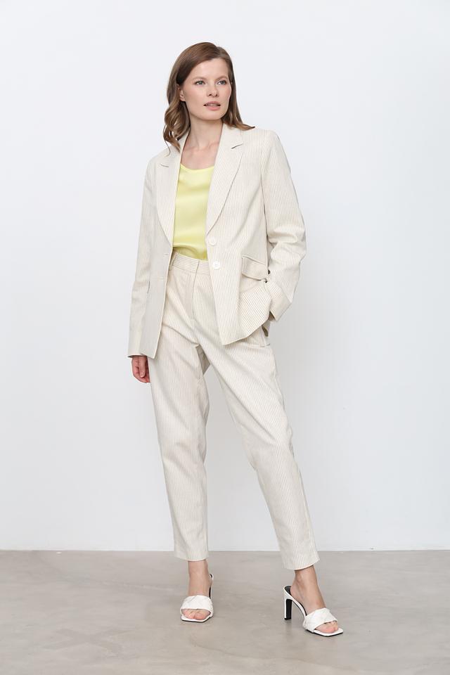 Топ имеет прямой крой, который обеспечивает комфортную посадку по фигуре. Округлый вырез горловины подчеркивает женственность и изящество. Отсутствие рукавов делает этот топ идеальным выбором для тёплой погоды.