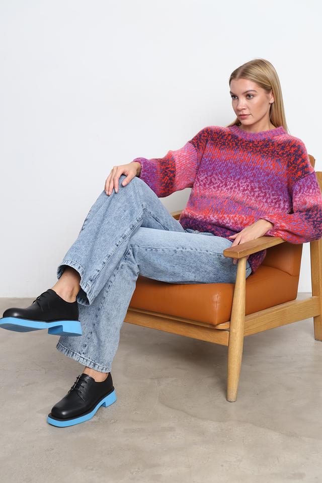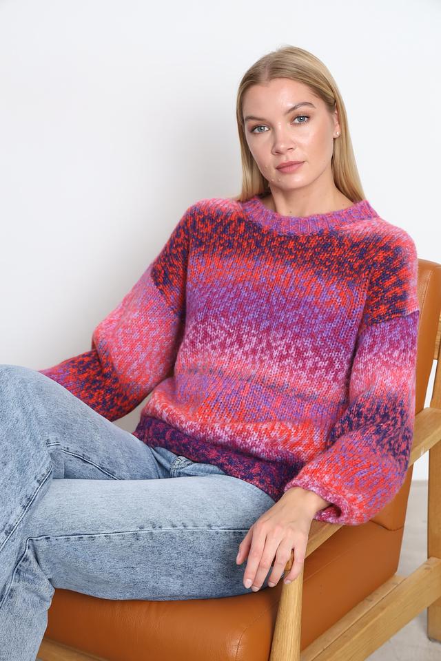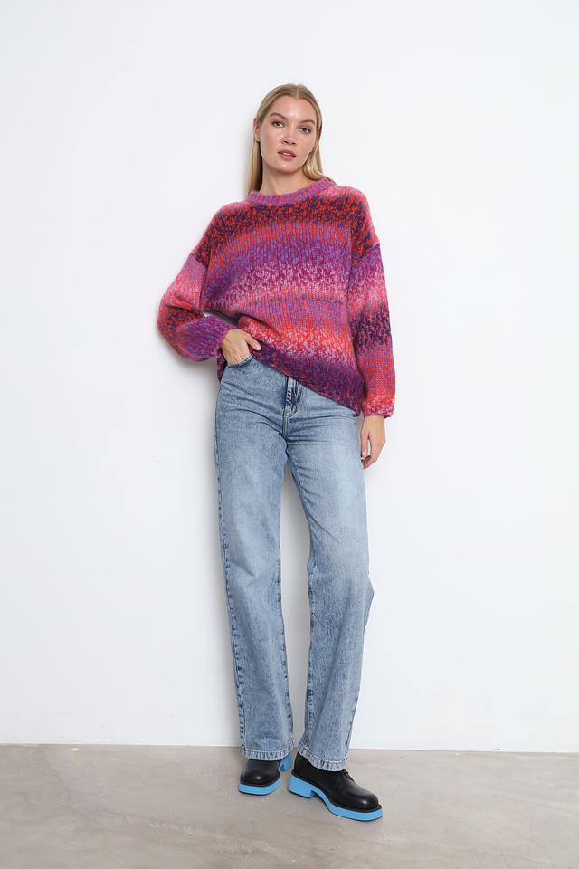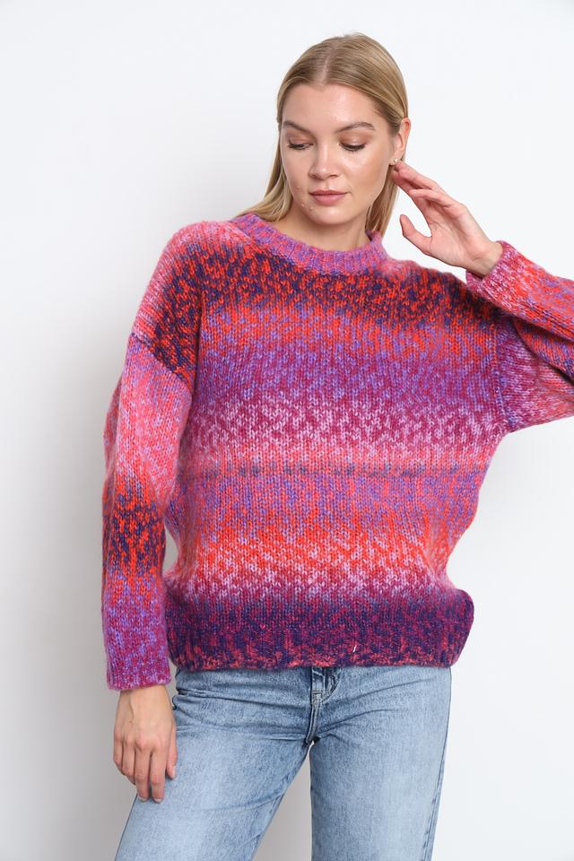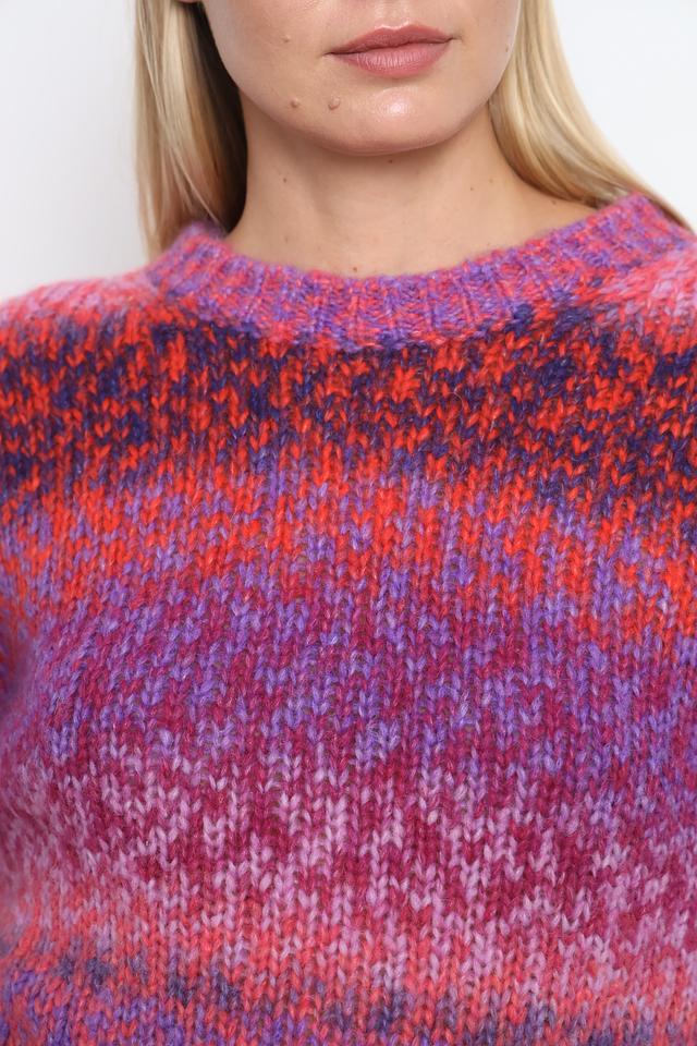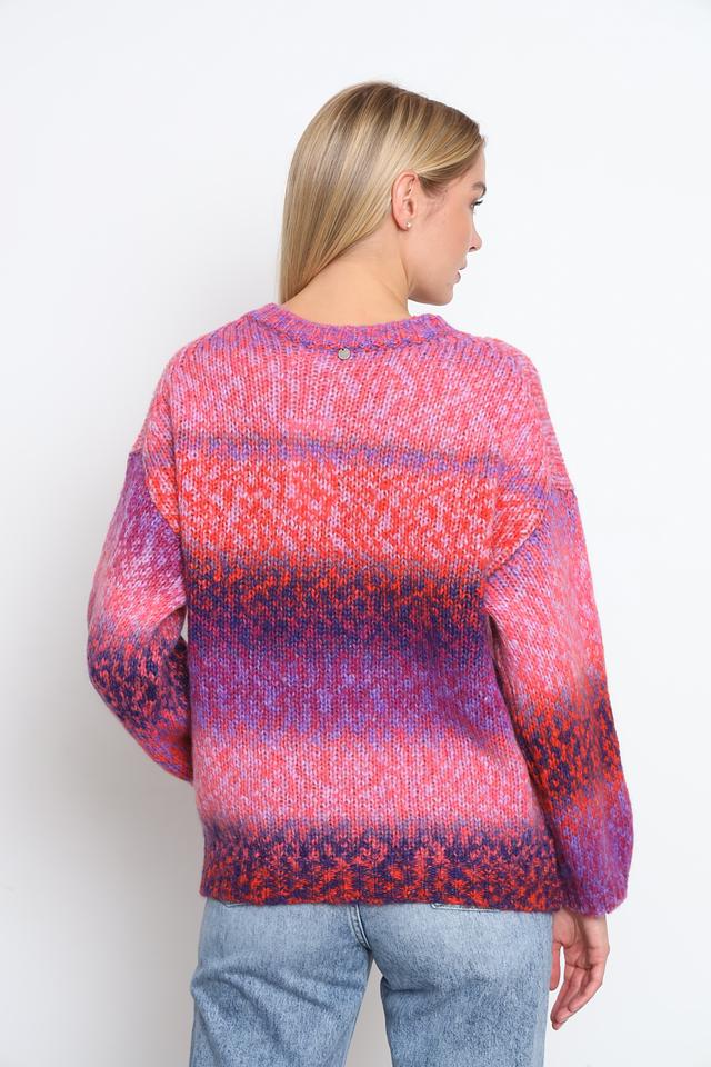 Пуловер имеет свободный, слегка оверсайз крой, который обеспечивает комфорт и свободу движений. Разноцветный узор, сочетающий в себе оттенки розового, фиолетового и оранжевого, придает изделию оригинальность и неповторимость.