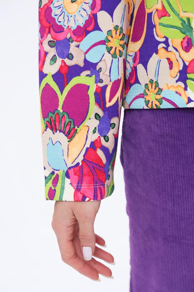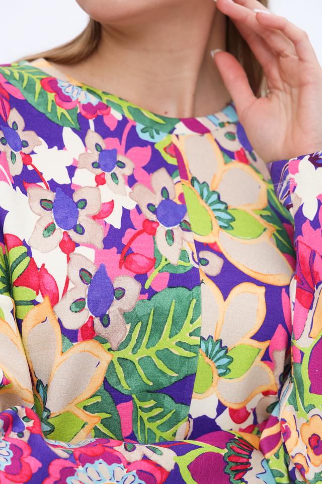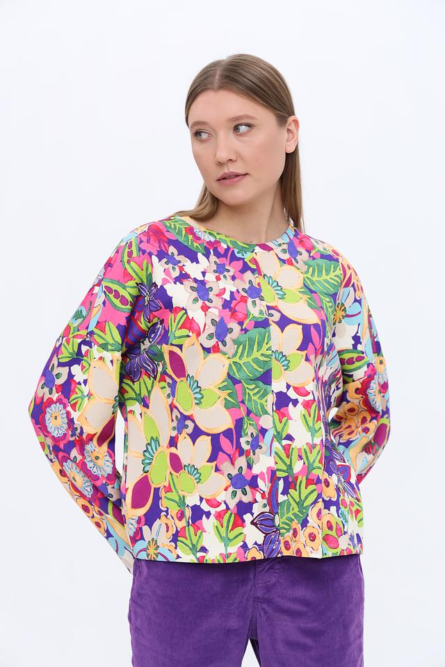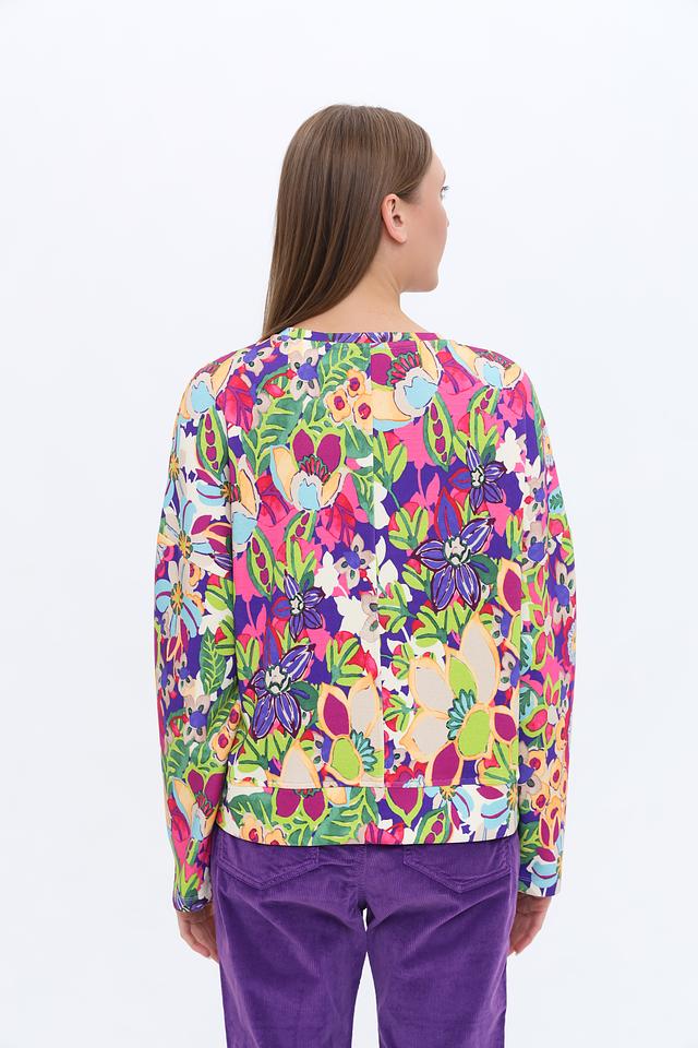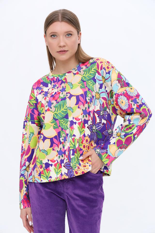 Пуловер имеет свободный крой, который не сковывает движений, и длинные рукава. Его особенностью является эффектный цветочный принт, сочетающий в себе множество ярких оттенков. Эта модель идеально подойдет для создания непринужденных и модных образов.