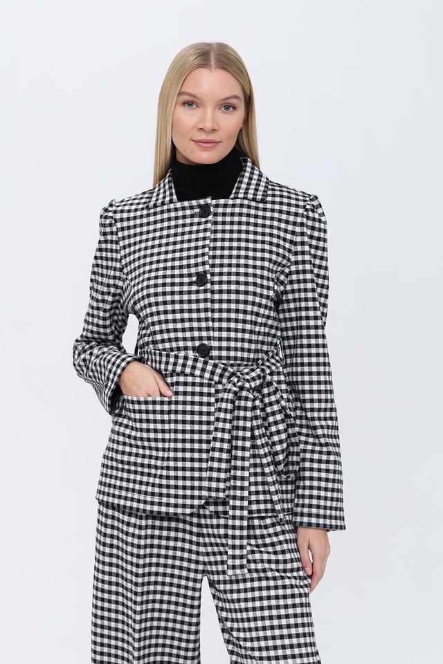 Жакет Rich and Royal чёрно-белого цвета – стильная модель прямого кроя с застёжкой на пуговицы и поясом. Жакет выполнен из плотной ткани в классическую клетку, что делает его универсальным дополнением к вашему гардеробу. Состав: полиэстер 59%, хлопок 40%, эластан 1%