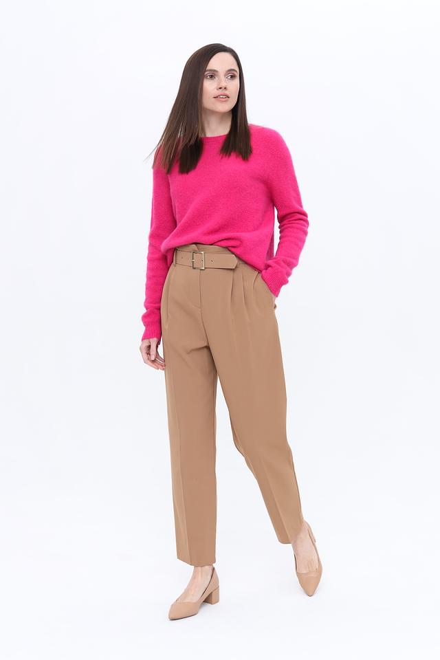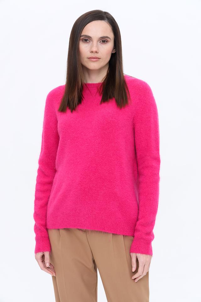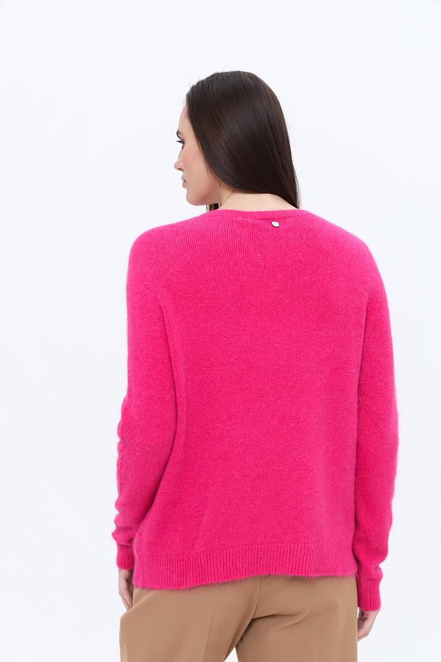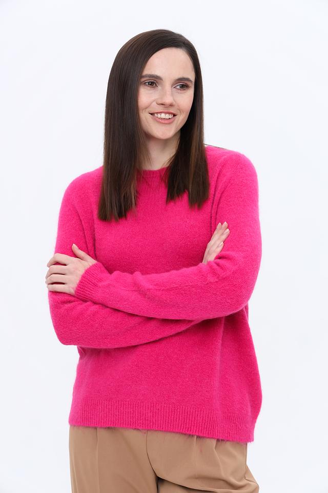 Пуловер имеет классический крой с круглым вырезом горловины и длинными рукавами. Яркий фуксиевый цвет добавит вашему образу свежести и индивидуальности. Текстура пряжи создает эффект легкой пушистости, делая изделие особенно привлекательным.