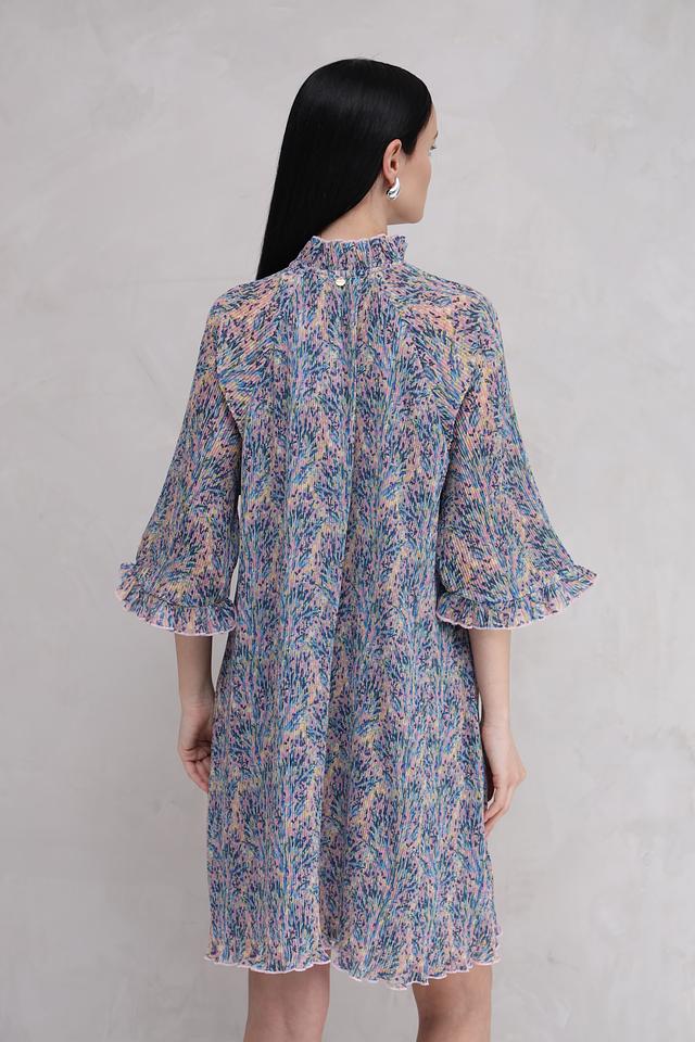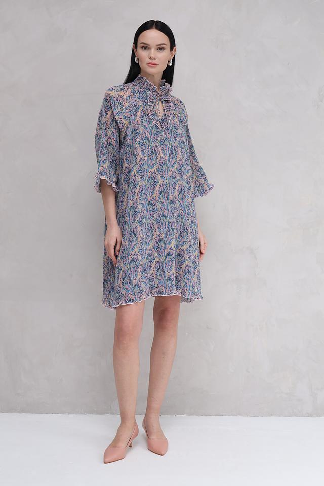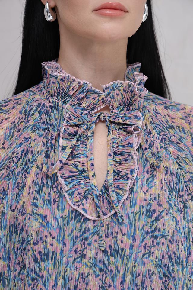 Платье имеет свободный крой, который не сковывает движений и подходит для разных типов фигур. Воротник-стойка с завязками создает элегантный акцент и позволяет регулировать вырез. Рукава 3/4 с воланами добавляют романтичности.