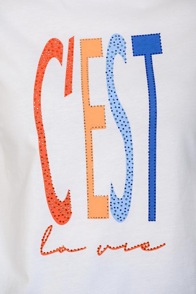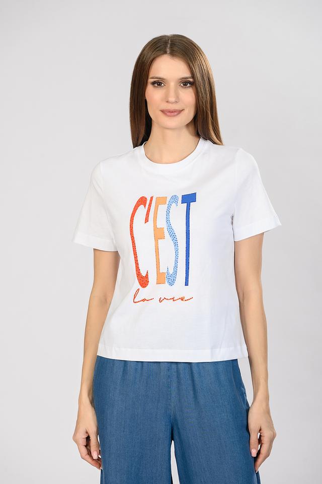 Основным акцентом является яркий принт "C'est la vie", выполненный в сочетании оранжевого, синего и красного цветов. Принт выполнен в виде надписи с эффектом текстуры, что придает футболке оригинальность.