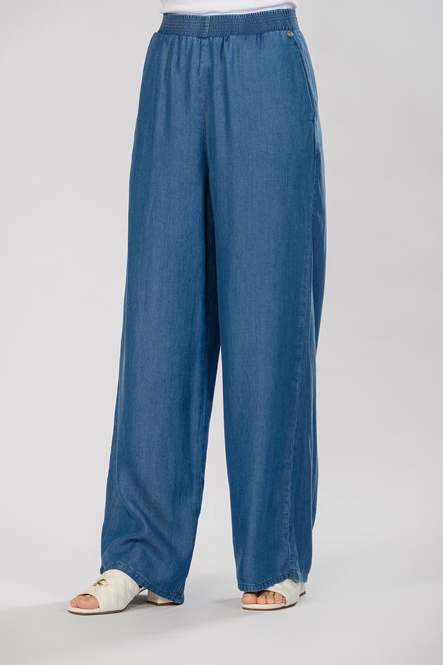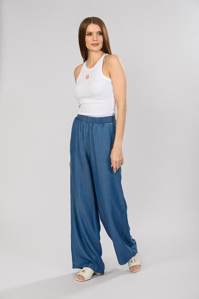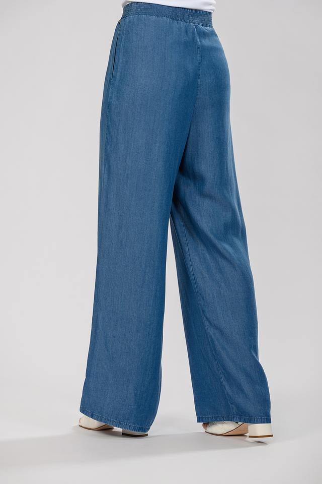 Брюки имеют классический деним-цвет, который легко сочетается с различными элементами одежды. Крой брюк клёш обеспечивает свободу движений и создает элегантный силуэт. Удобный эластичный пояс гарантирует комфортную посадку по фигуре.