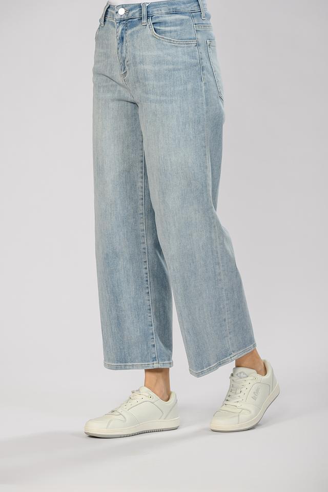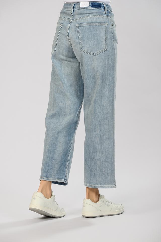 Джинсы имеют высокую посадку, которая подчеркивает талию и создает элегантный силуэт. Прямой крой обеспечивает комфорт и свободу движений, а слегка укороченная длина делает их идеальными для ношения с кедами или ботинками.