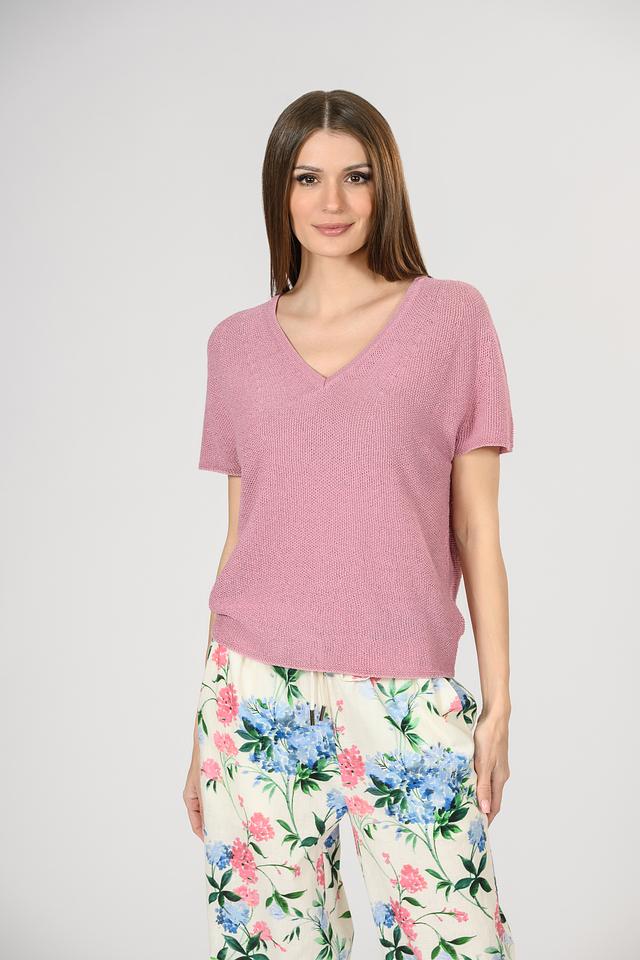 Модель имеет V-образный вырез и короткие рукава, что делает ее идеальным выбором для теплой погоды. Пуловер имеет слегка приталенный силуэт, который подчеркивает фигуру.