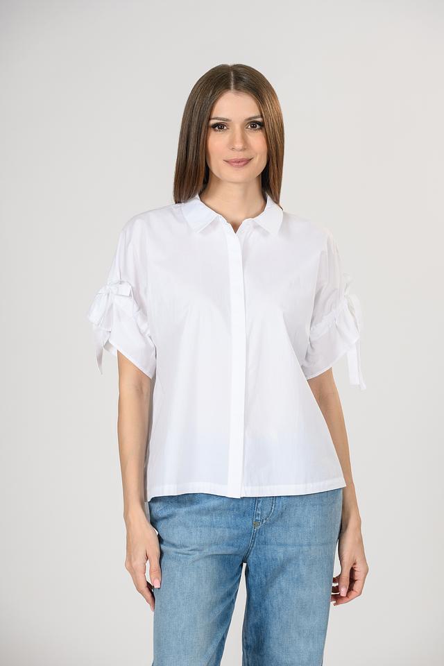 Блуза имеет прямой крой, который обеспечивает свободу движений и комфорт в течение всего дня. Короткие рукава с декоративными завязками придают блузе особый шарм и изысканность.