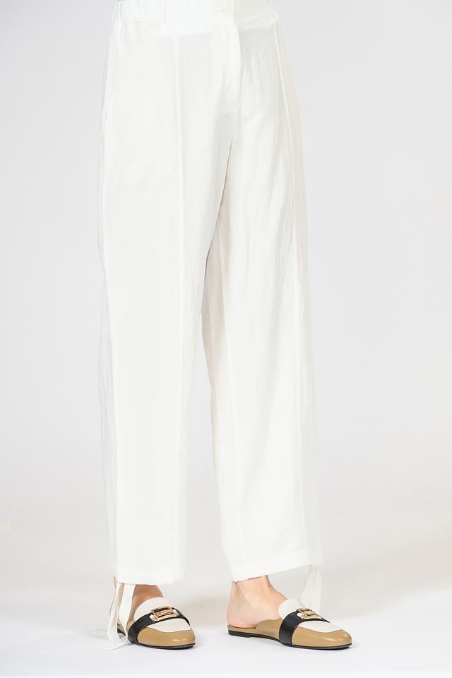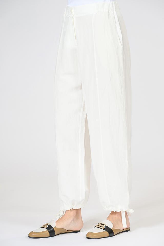Брюки имеют завышенную талию, которая визуально удлиняет ноги и подчеркивает фигуру. Широкий крой обеспечивает свободу движений и комфорт в течение всего дня. Завязки на щиколотках позволяют регулировать посадку и добавляют брюкам оригинальности.