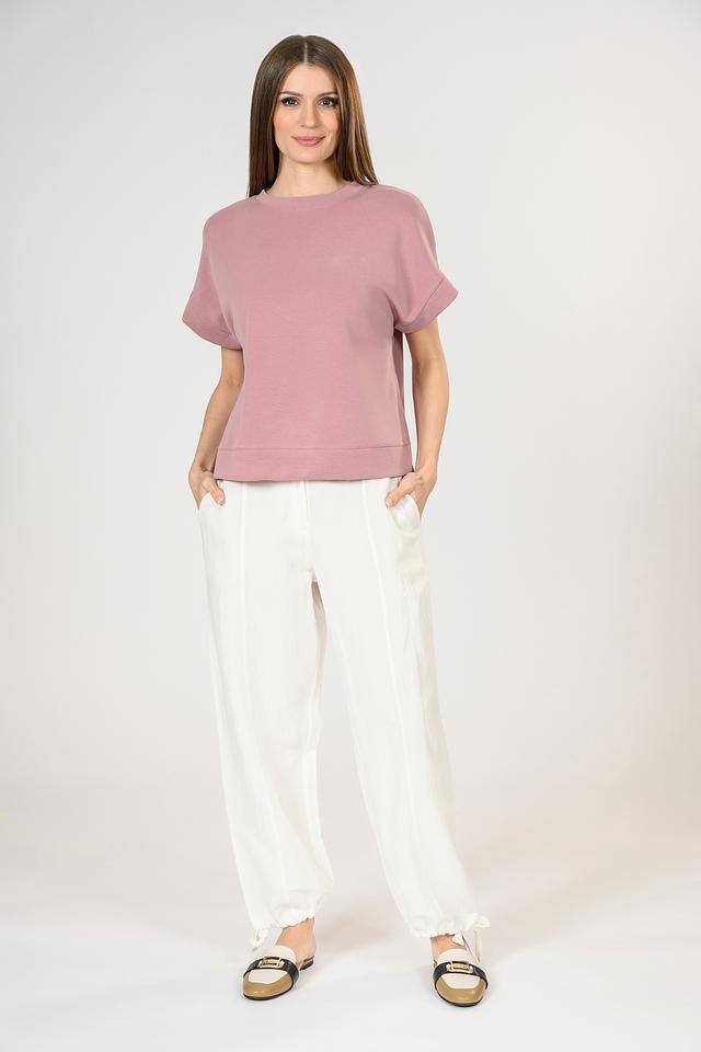 Особенности модели: завышенная талия, широкие брючины, завязки на щиколотках, два боковых кармана.