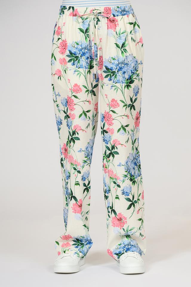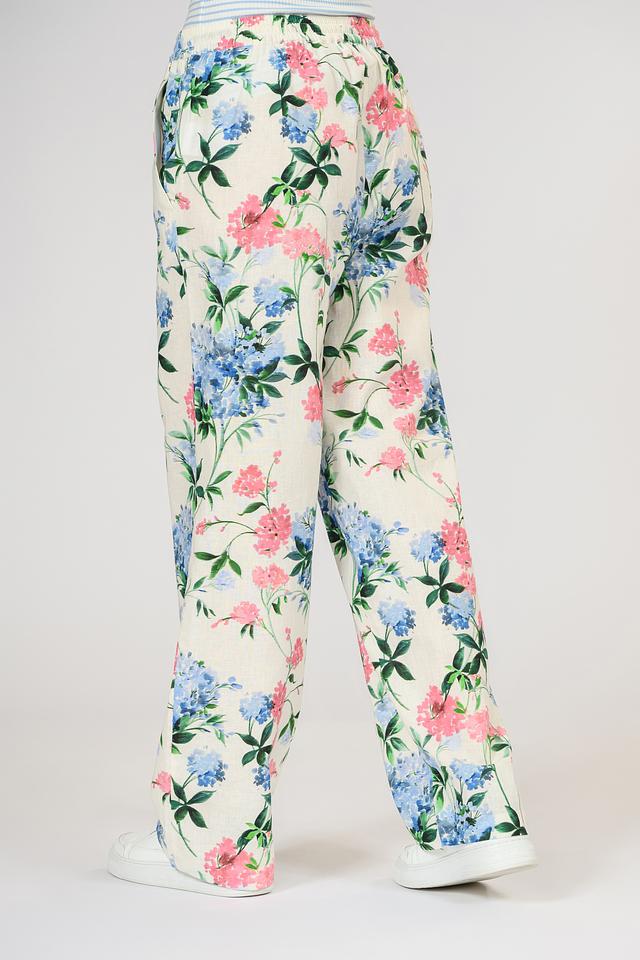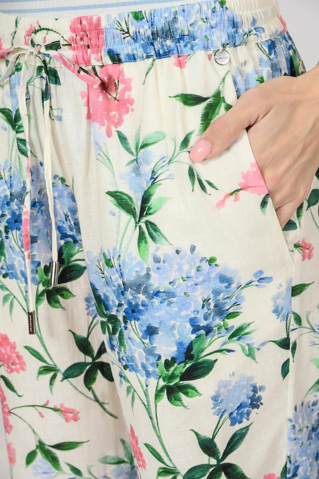 Женские брюки Rich and Royal кремового цвета с ярким цветочным принтом. Изготовлены из натурального льна и хлопка, обеспечивающих комфорт и воздухопроницаемость. Состав: лен 55%, хлопок 45%