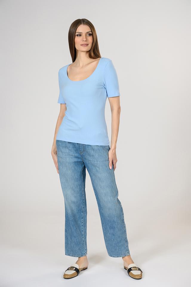 Женская футболка Rich and Royal голубого цвета выполнена из приятного в носке трикотажа в рубчик. Приталенный силуэт и округлый вырез горловины подчеркивают фигуру, а эластан в составе обеспечивает комфортную посадку. Состав: хлопок 95%, эластан 5%