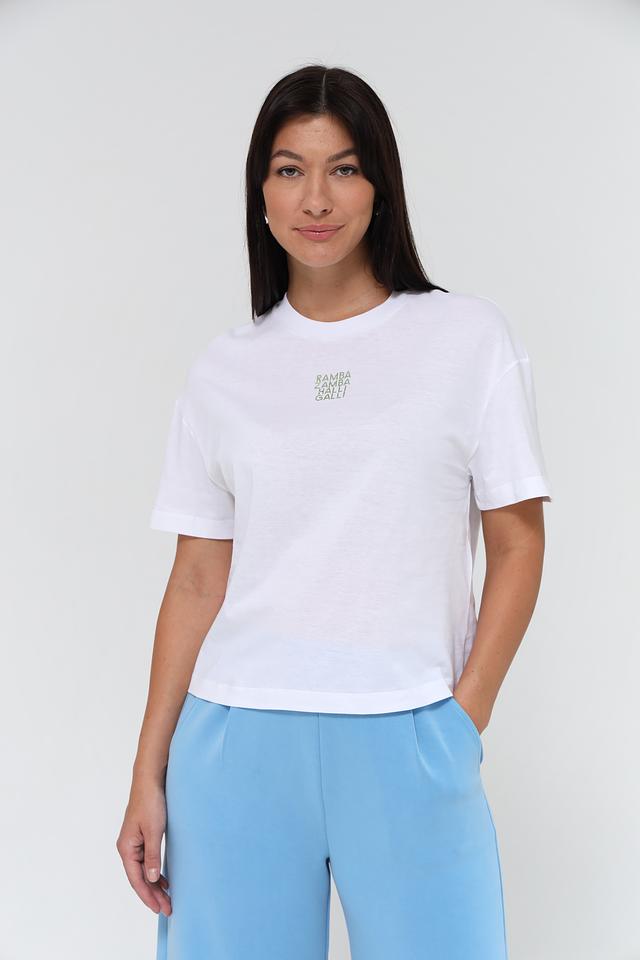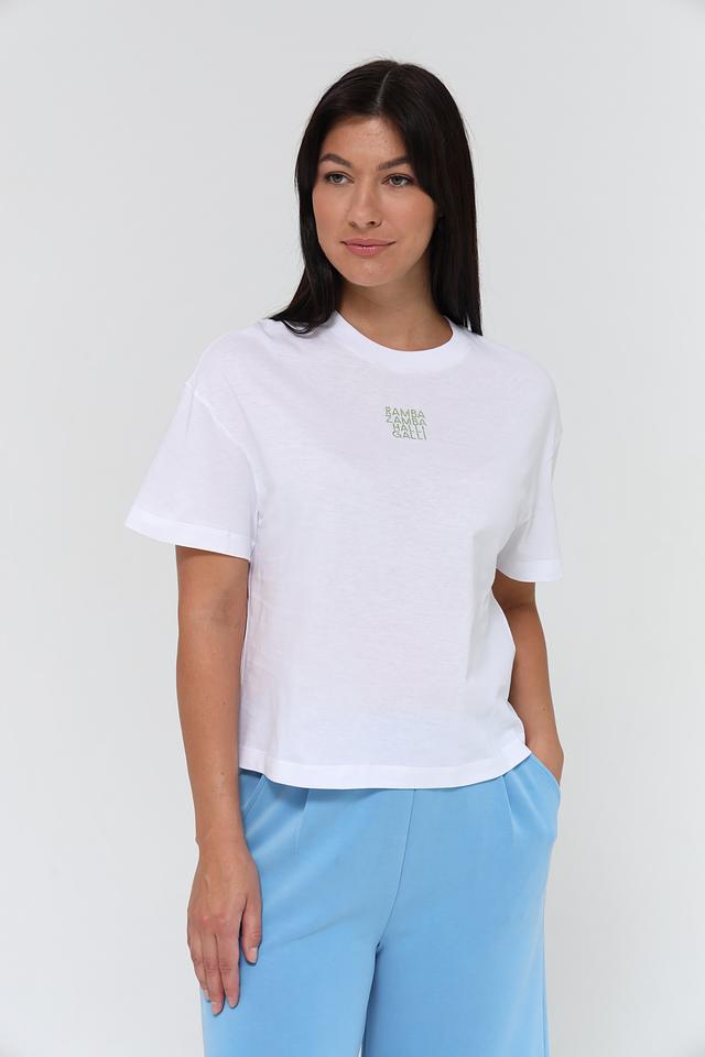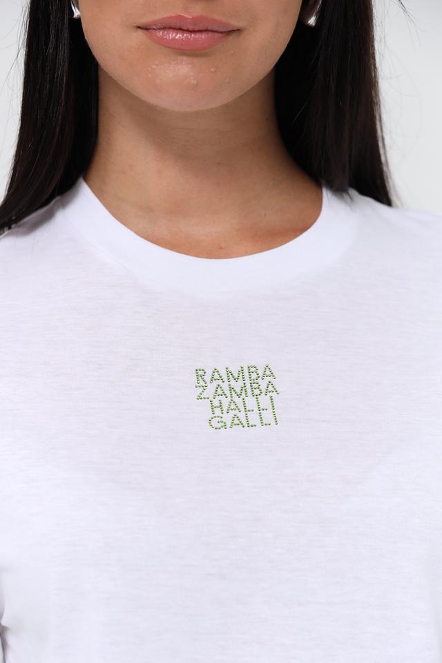 Футболка имеет укороченный крой и свободный силуэт, что придает ей современный и непринужденный вид. Небольшой принт с надписью "RAMBA ZAMBA HALLI GALLI" добавляет оригинальности и индивидуальности.
