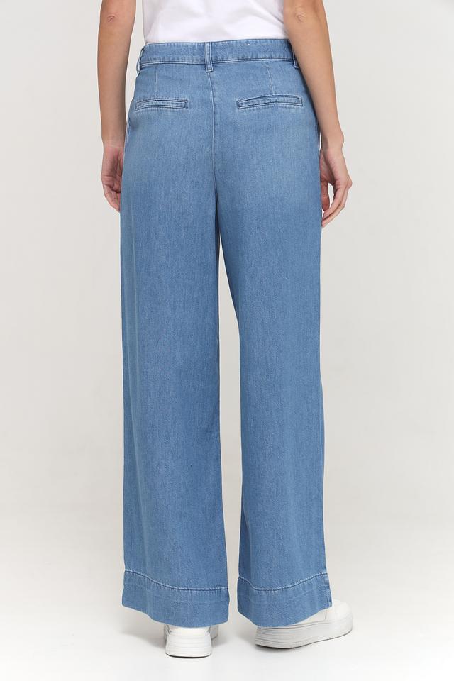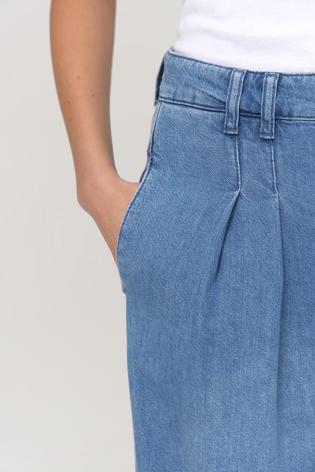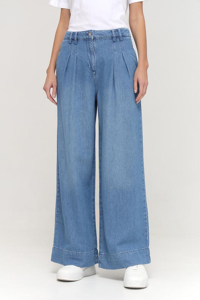 Джинсы имеют широкую штанину, которая визуально удлиняет ноги и создает элегантный силуэт. Высокая посадка подчеркивает талию и обеспечивает комфортную посадку. На поясе расположены аккуратные складки, добавляющие модели изысканности.