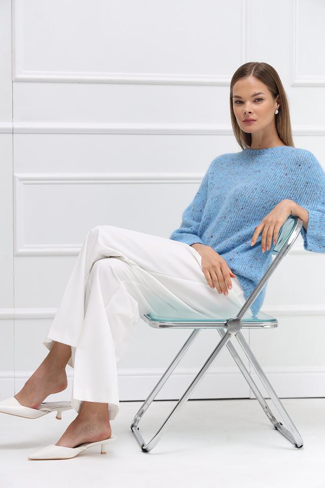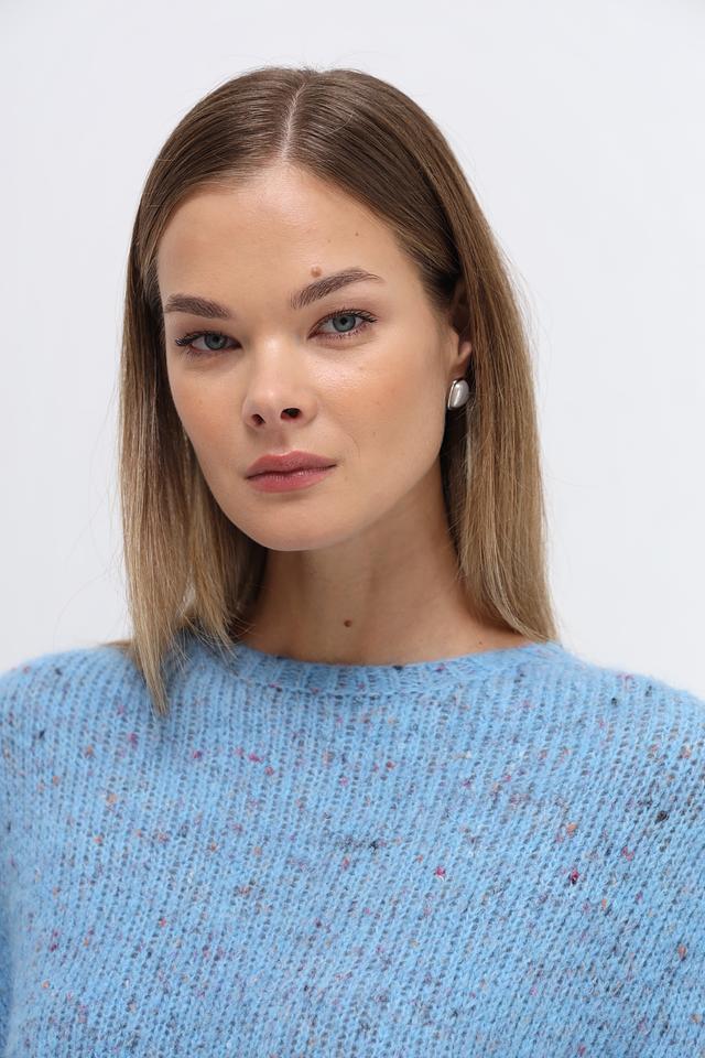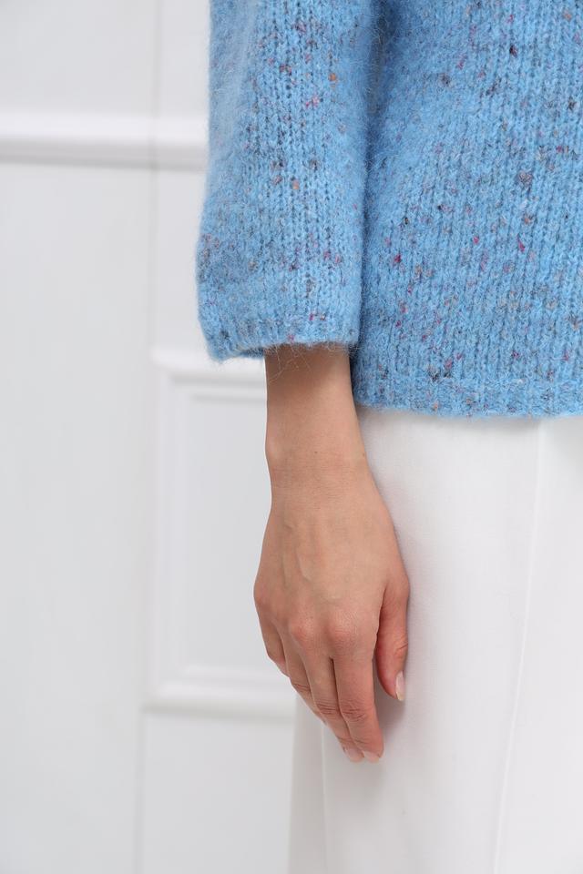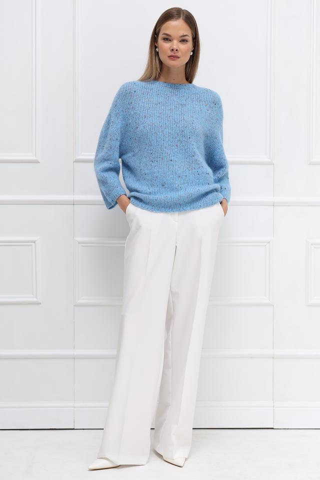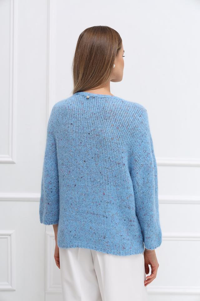 Пуловер имеет нежный голубой цвет с деликатными вкраплениями других оттенков, что придает ему особый шарм и текстуру. Округлый вырез горловины и рукава три четверти делают его универсальным для различных образов.