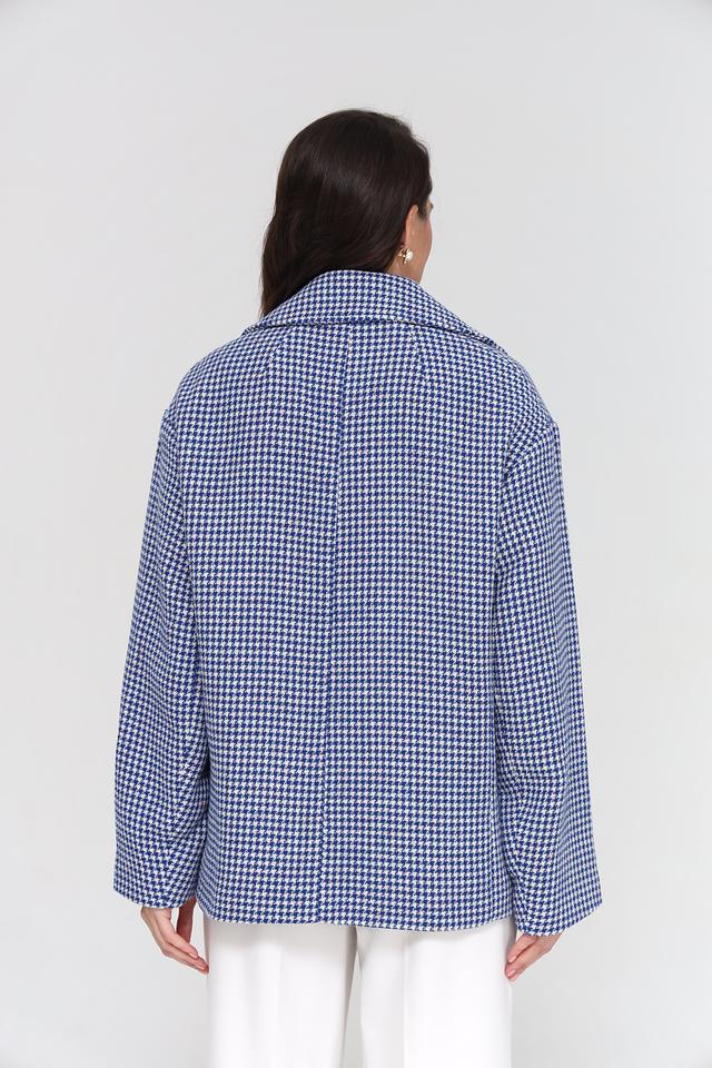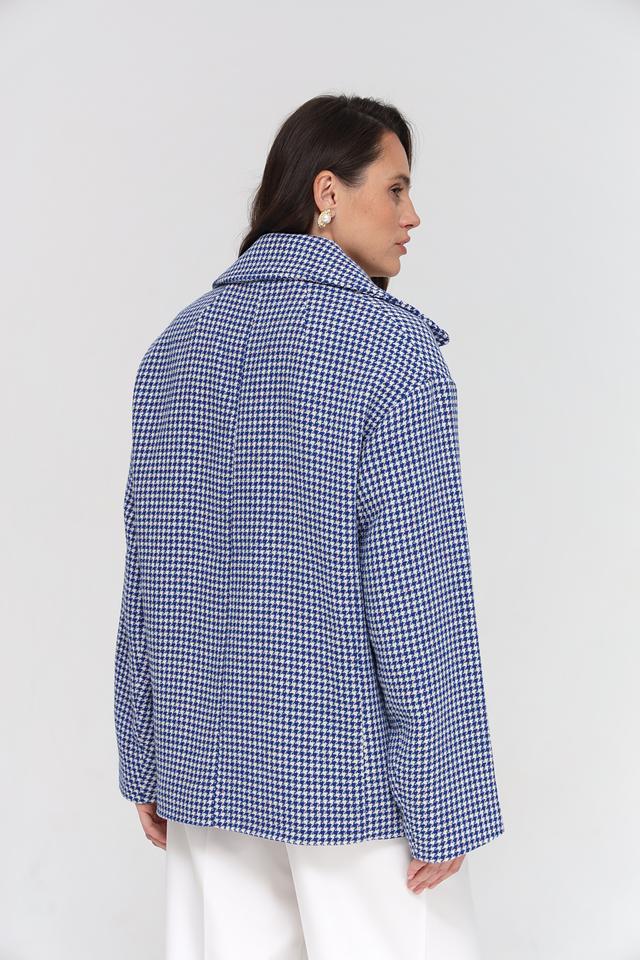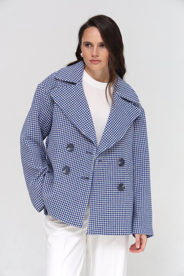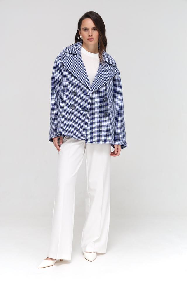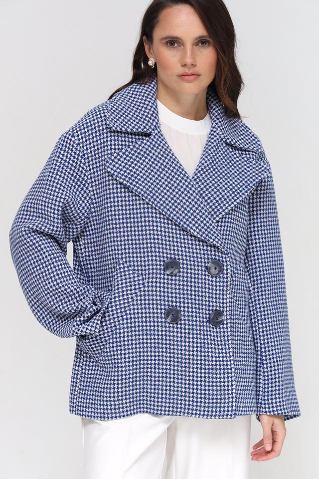 Куртка имеет двубортную застежку на крупные пуговицы, что подчеркивает ее элегантный стиль. Прямой крой обеспечивает комфортную посадку по фигуре, а слегка заниженная линия плеч создает современный силуэт.