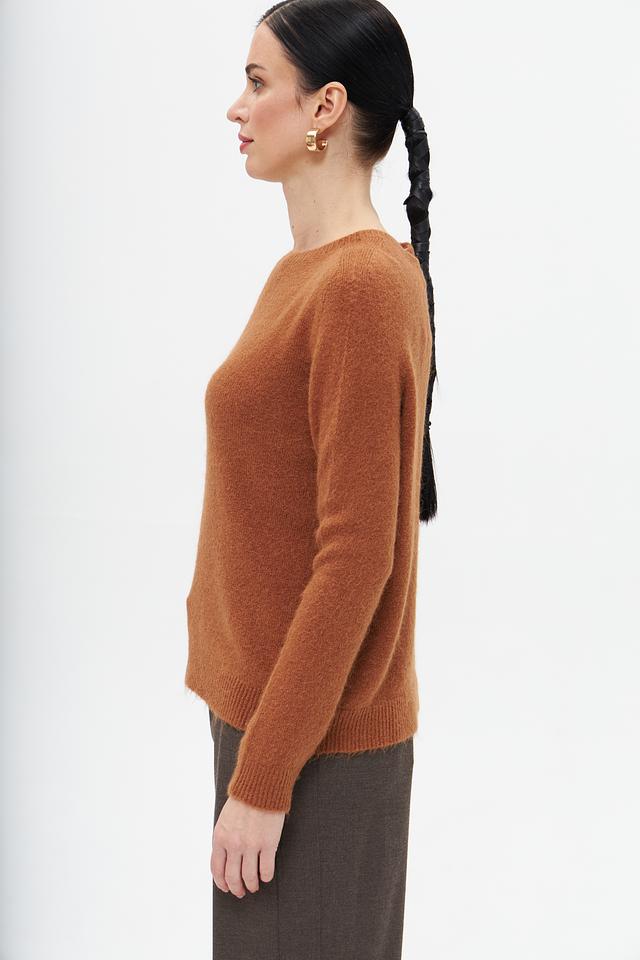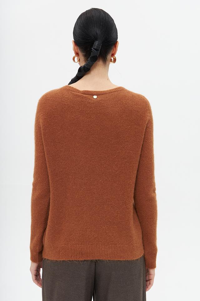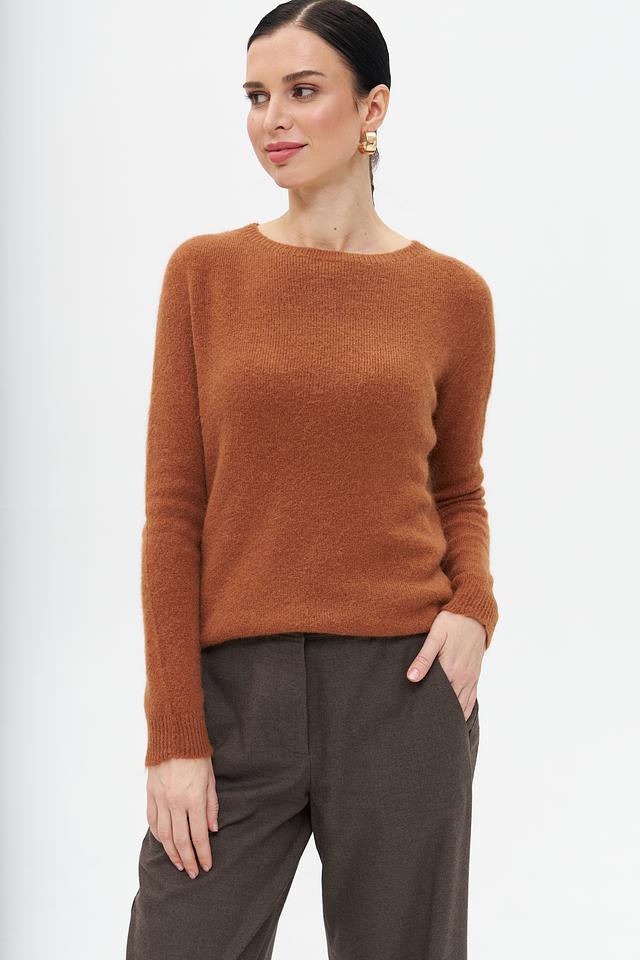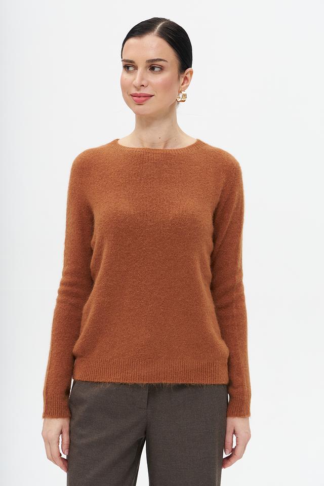 Пуловер имеет классический крой с округлым вырезом горловины, что делает его универсальным для различных стилей. Рыжий цвет придает образу яркость и индивидуальность.