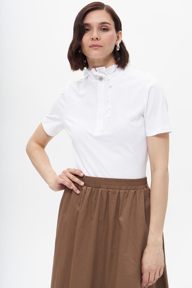 Белая блузка Rich and Royal с короткими рукавами и воротником-стойкой, украшенным рюшами. Модель выполнена из 100% хлопка, обеспечивающего комфорт и воздухопроницаемость. Состав: хлопок 100%