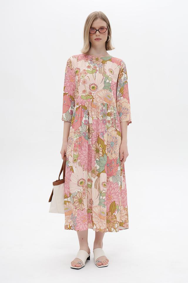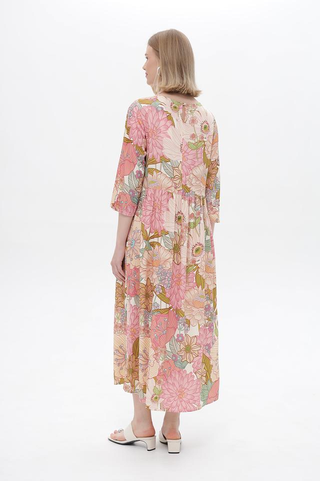 Основной цвет платья – нежно-розовый, который служит прекрасным фоном для яркого и красочного цветочного принта. Принт включает в себя различные оттенки розового, оранжевого, зеленого и голубого, создавая эффектный и запоминающийся образ.