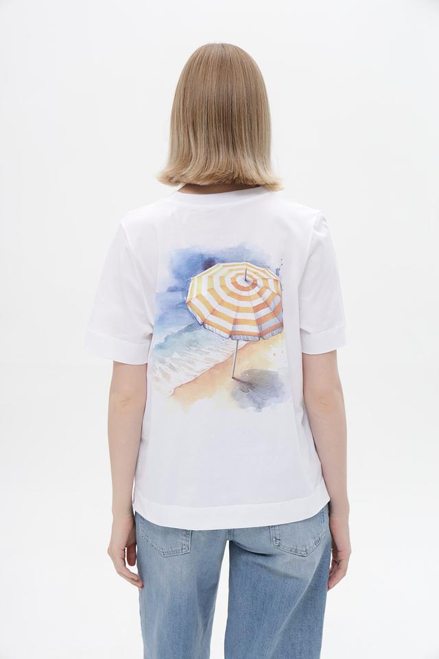 На спине футболки расположен красочный принт с изображением пляжного зонтика, создающий атмосферу отдыха и беззаботности. Модель имеет прямой крой и короткие рукава, что обеспечивает комфорт в жаркую погоду.