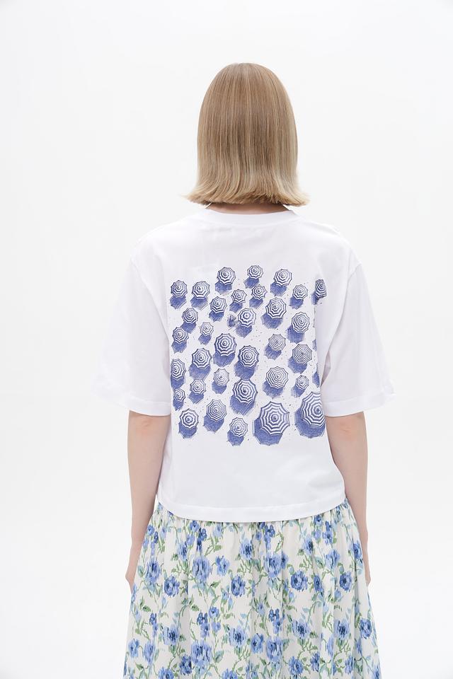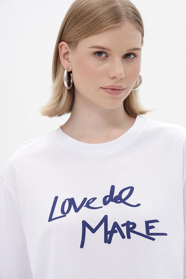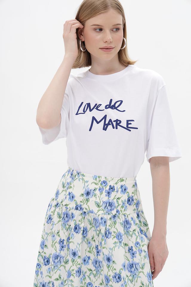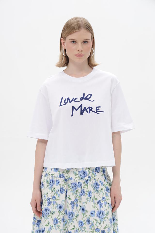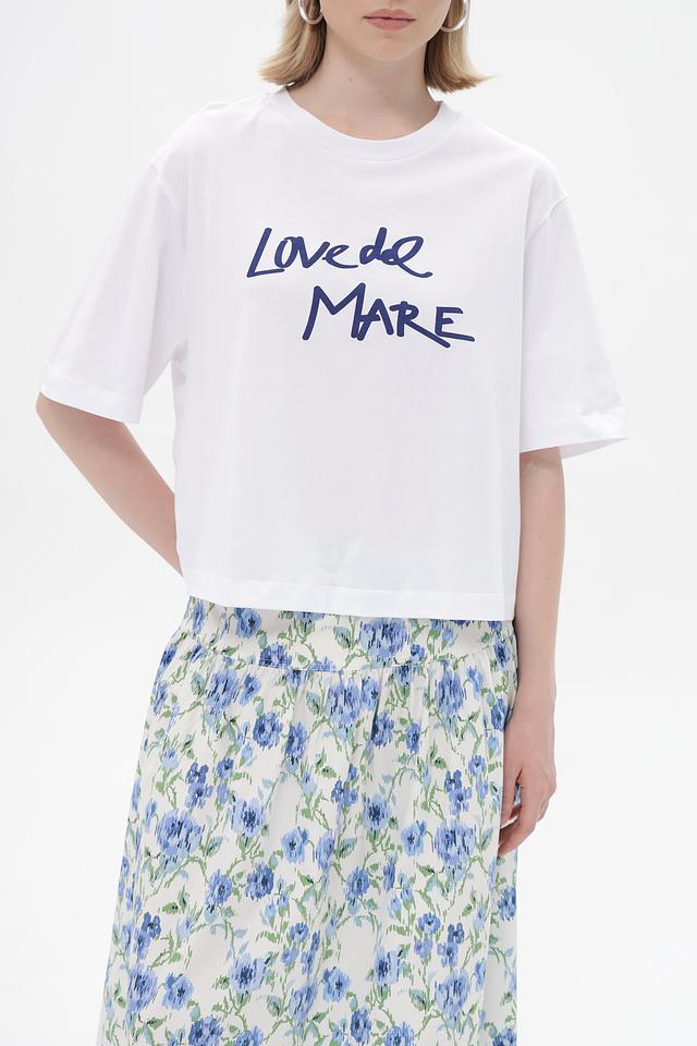 Особенностью данной модели является яркий принт "Love de Mare" на лицевой стороне и оригинальный рисунок из зонтиков на спине. Прямой крой и короткие рукава делают футболку универсальной и подходящей для различных типов фигур.