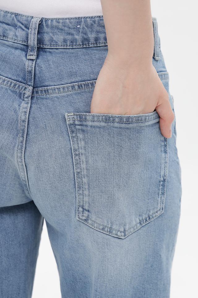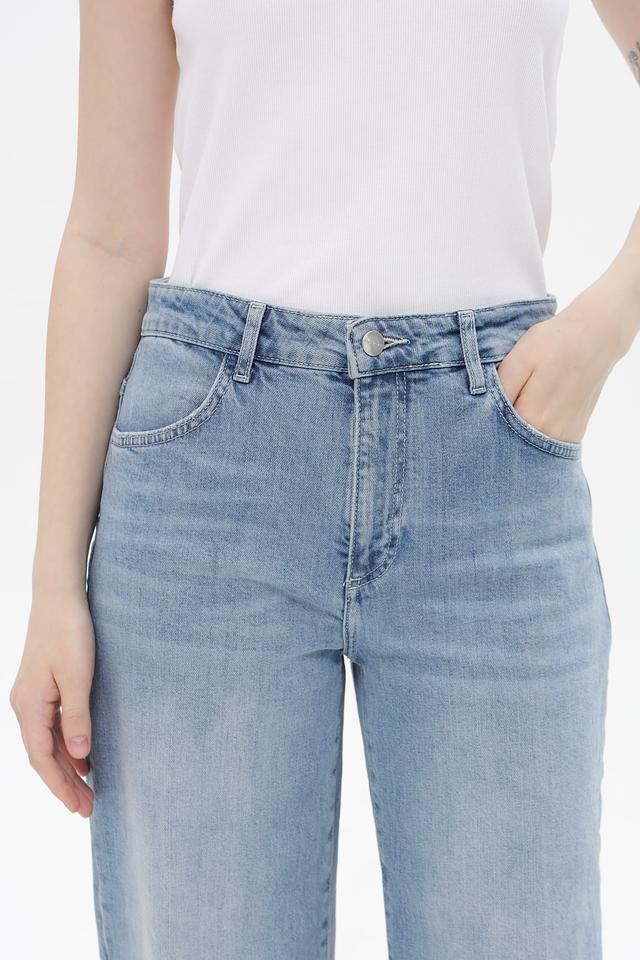 Джинсы имеют высокую посадку, подчеркивающую талию, и широкий пояс для дополнительной поддержки. Классические пять карманов обеспечивают функциональность, а эффект потертости придает образу непринужденность и винтажный шарм.