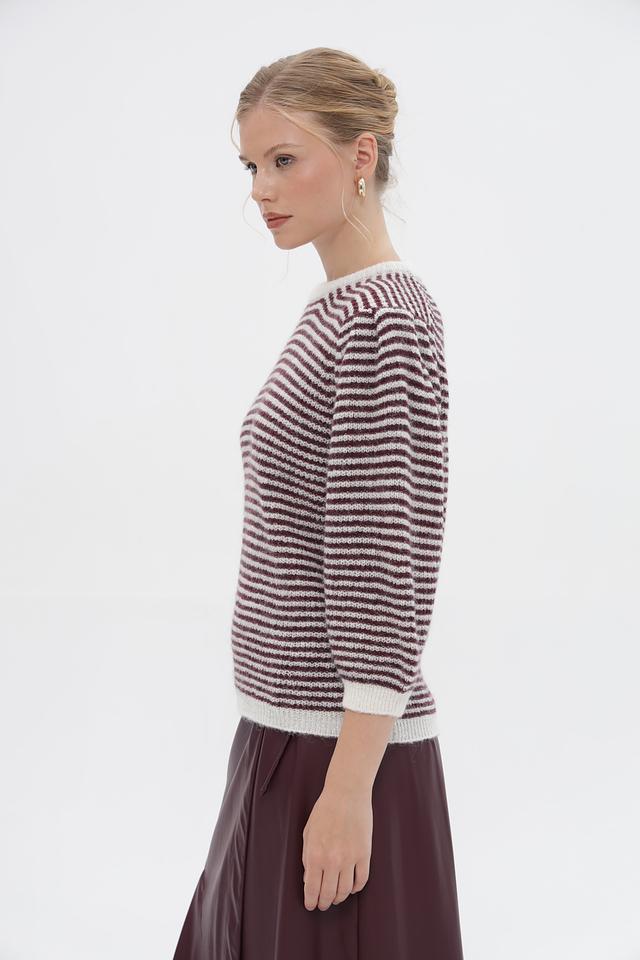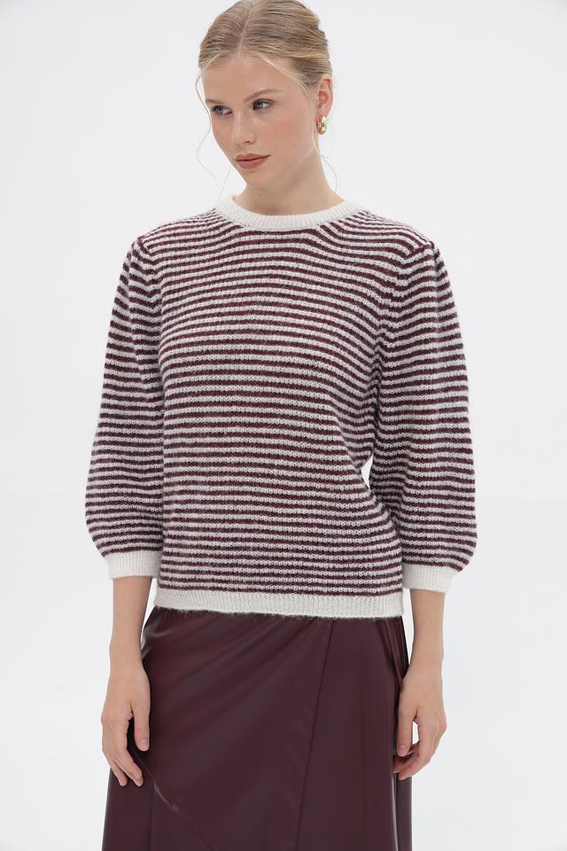 Женский пуловер Rich and Royal бордового цвета в полоску, выполнен из мягкой смеси полиамида, акрила и альпаки. Модель с округлым вырезом горловины и рукавами 3/4 станет отличным дополнением к вашему гардеробу. Состав: акрил 40%, полиамид 30%, альпака 30%