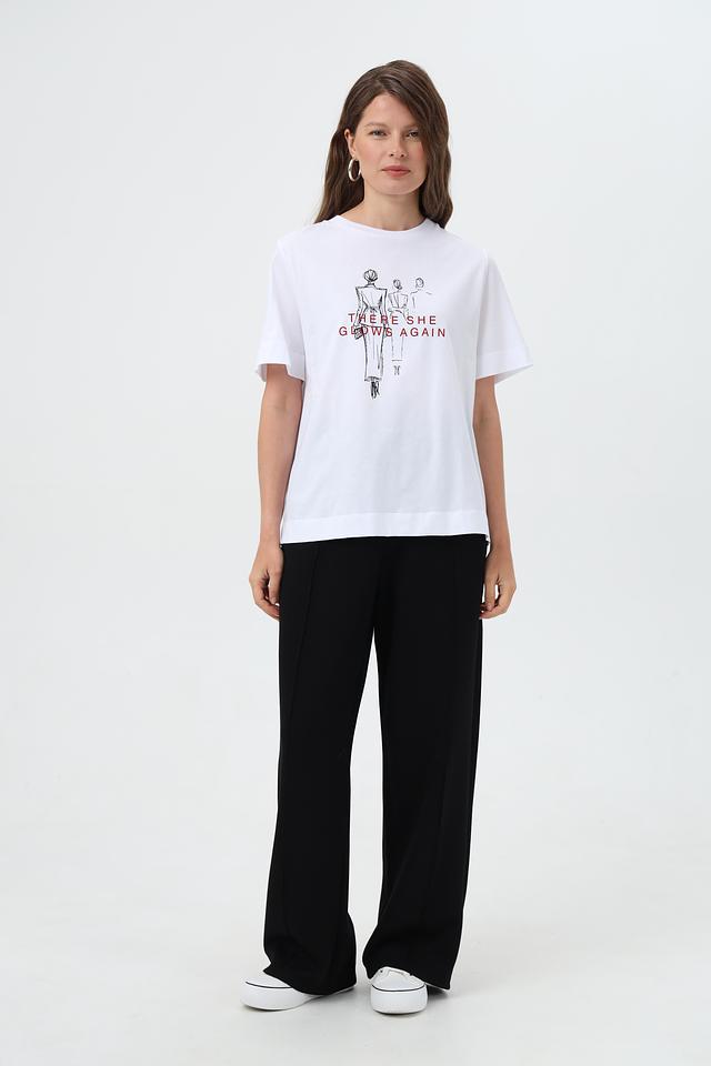 Футболка имеет прямой, слегка свободный крой, который не сковывает движений. Круглый вырез горловины и короткие рукава делают ее идеальным выбором для теплой погоды.