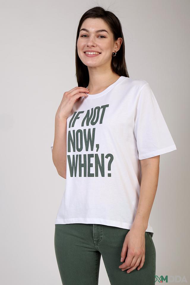 Футболка имеет прямой крой и короткие рукава, что делает её универсальной для различных образов. На передней части футболки расположен яркий принт с надписью "IF NOT NOW, WHEN?", который придаёт ей индивидуальность и стиль.