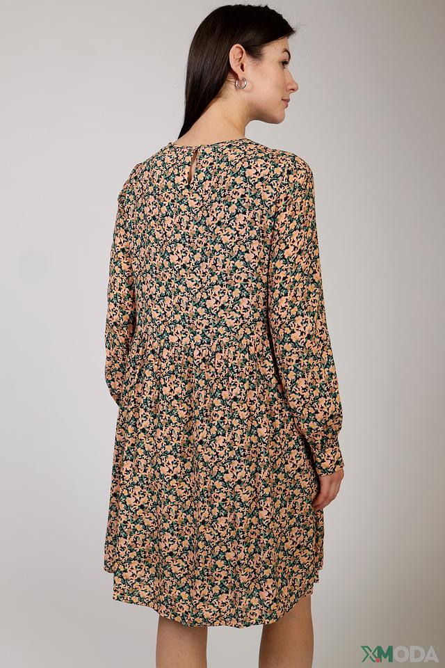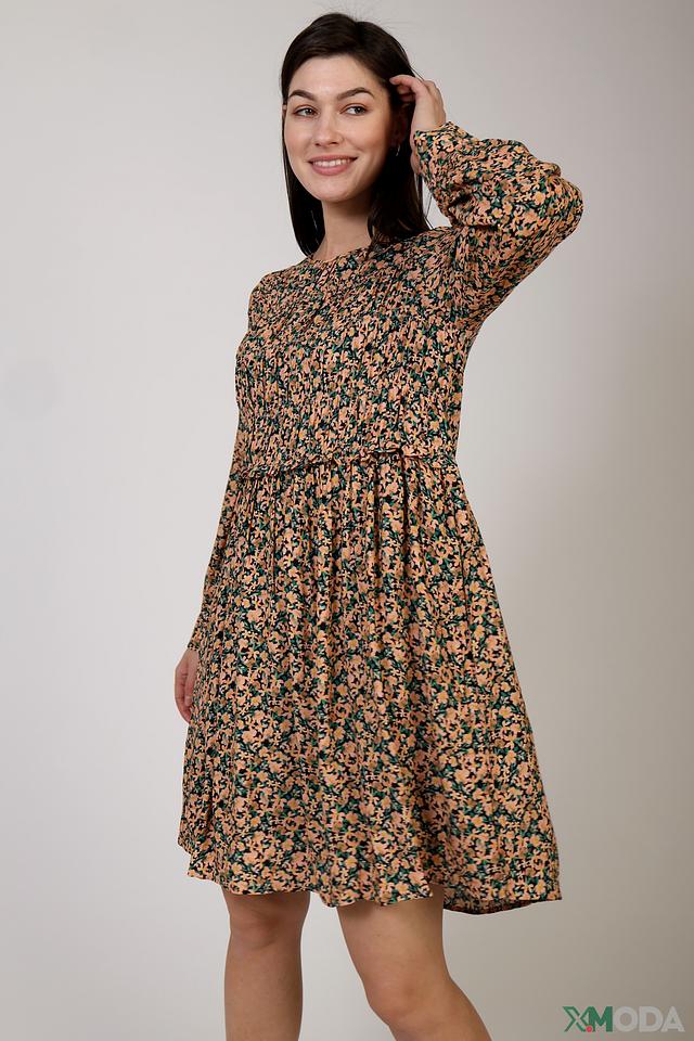 Платье имеет длину мини, длинные рукава с манжетами и круглый вырез горловины. Талия подчеркнута эластичной вставкой и небольшими складками, что создает женственный силуэт. Принт с мелкими цветами придает платью романтичный вид.