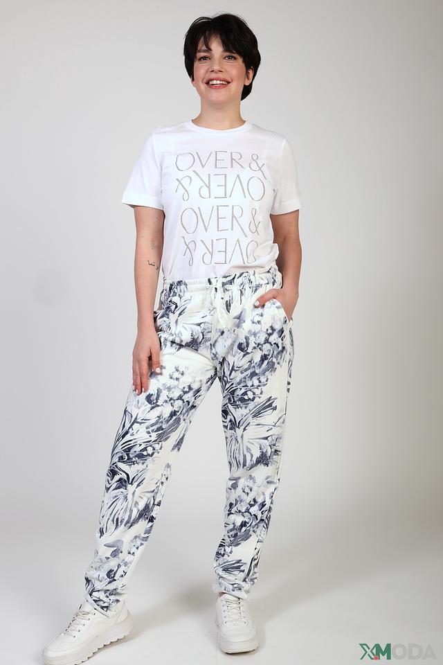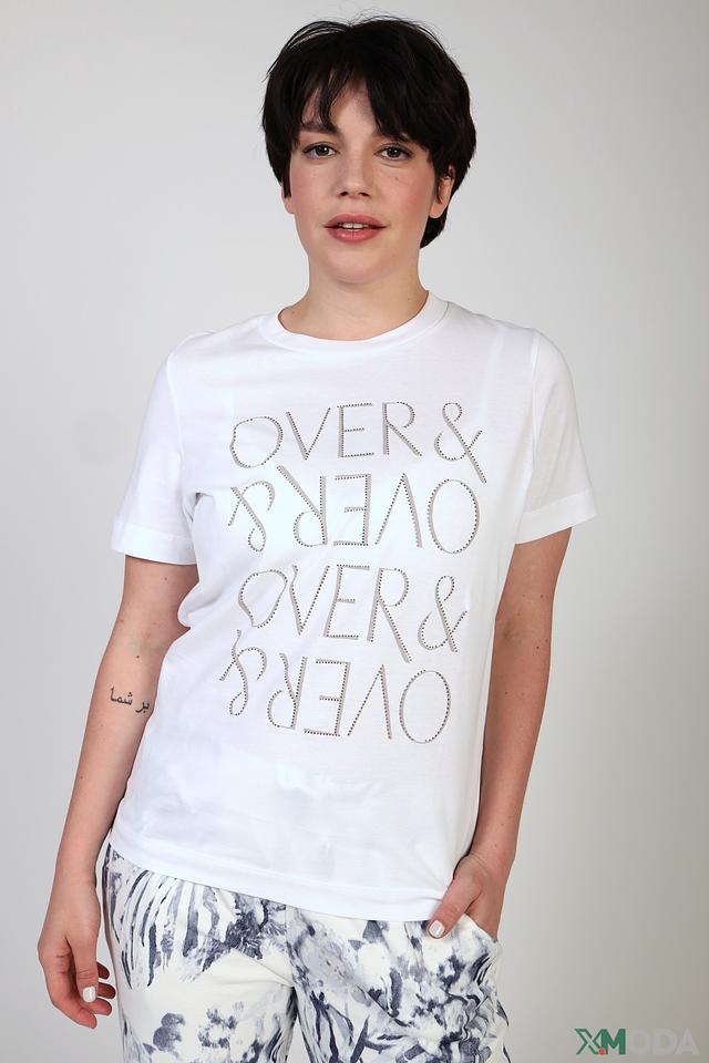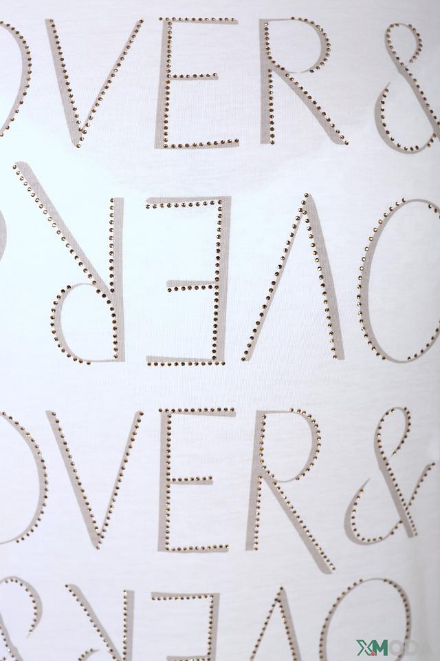 Особенностью данной модели является эффектная надпись "OVER & OVER", выполненная серебристым декором, придающим футболке оригинальность и привлекательность. Прямой крой обеспечивает свободу движений, а короткий рукав делает ее идеальной для теплой погоды.