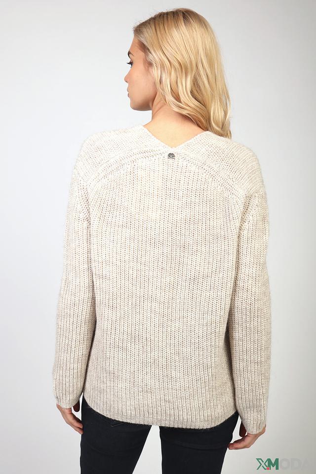 Этот стильный пуловер от Rich and Royal выполнен в нежном бежевом цвете и имеет классический крой. V-образный вырез подчеркивает линию шеи, а текстурное вязание придает изделию особый шарм.