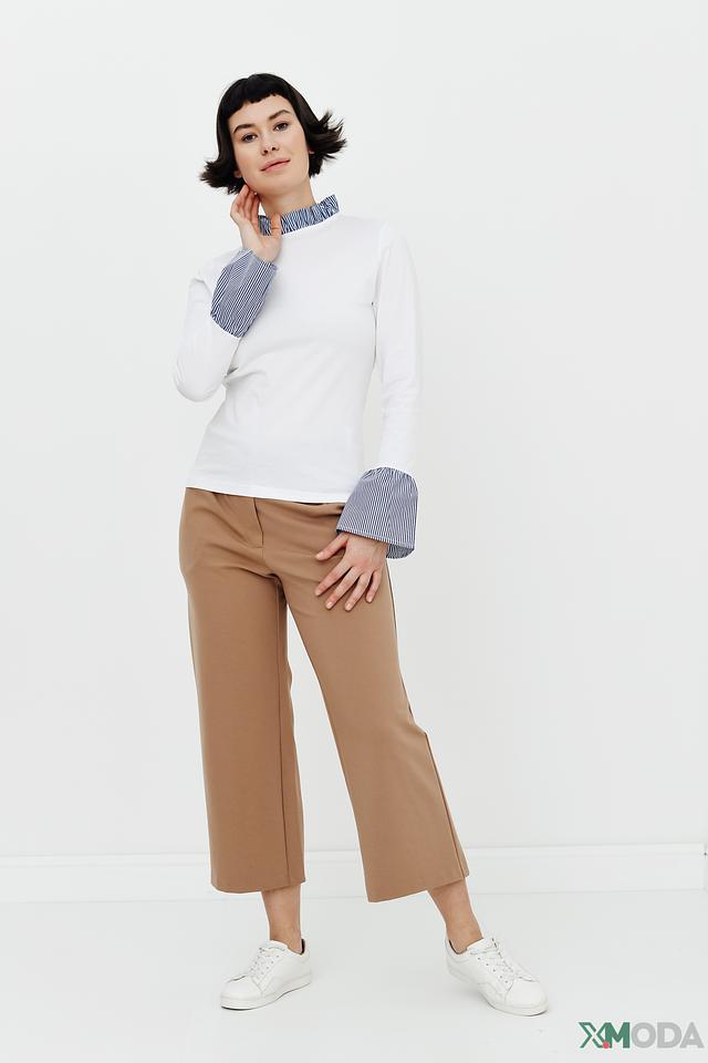 Вырез горловины оформлен декоративной отделкой в тон полоске на манжетах, что придает блузе особый шарм. Модель имеет свободный крой, обеспечивающий комфорт в носке.