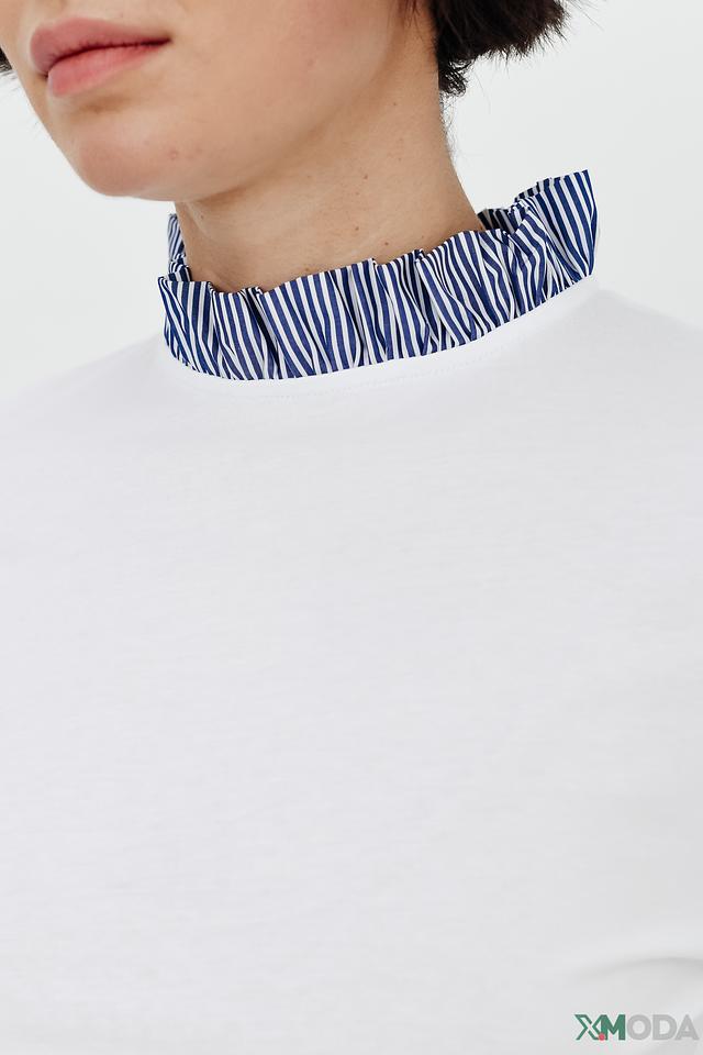 Эта стильная блуза от Rich and Royal станет прекрасным дополнением к вашему гардеробу. Блуза выполнена в белом цвете и имеет длинные рукава, манжеты которых выполнены из ткани в синюю полоску.