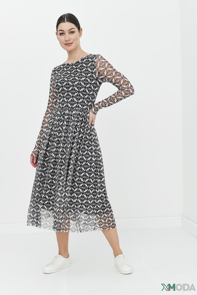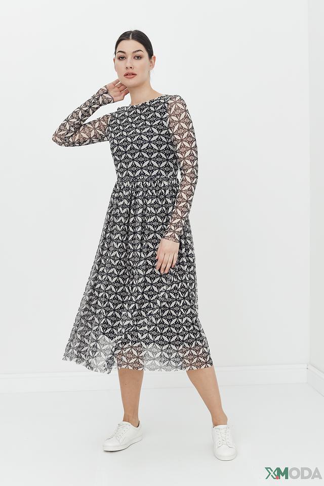 Модель имеет длину миди, длинные рукава из полупрозрачной сетки и приталенный силуэт, подчеркивающий фигуру. Юбка-солнце обеспечивает свободу движений и создает легкий, воздушный образ. Платье выполнено из высококачественного полиэстера, что гарантирует его долговечность и простоту в уходе.