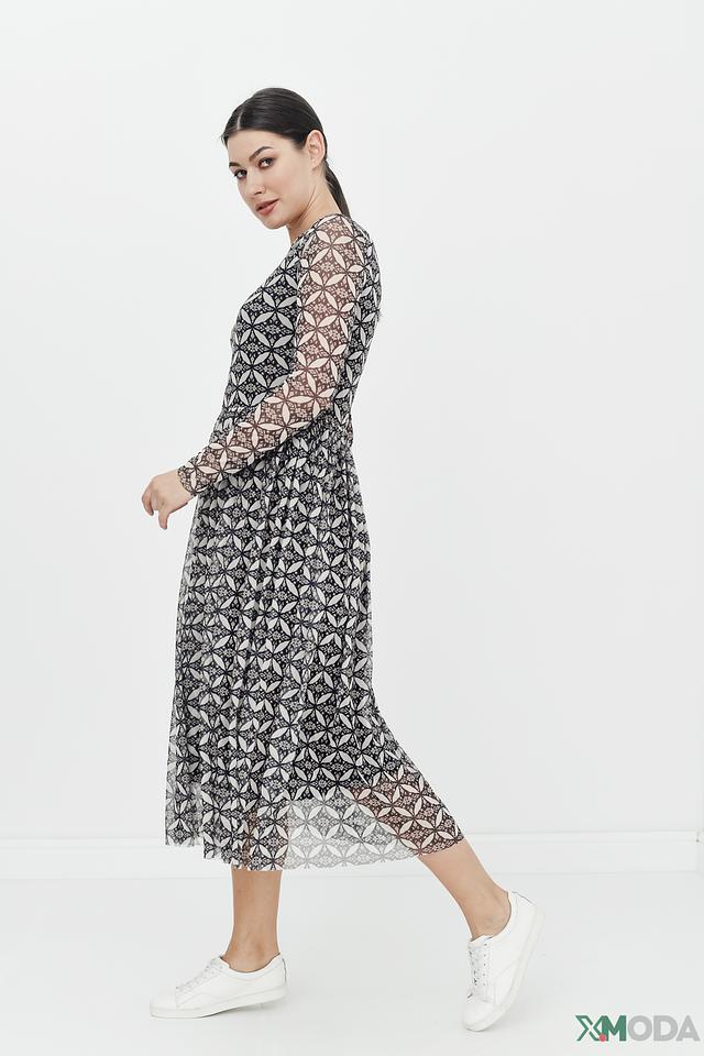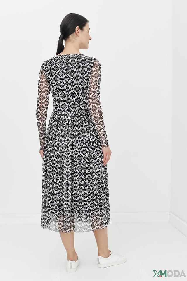 Элегантное платье Rich and Royal чёрно-белого цвета с геометрическим принтом и длинными рукавами. Модель выполнена из полиэстера и имеет приталенный силуэт с юбкой-солнце, что обеспечивает комфорт и свободу движений. Состав: полиэстер 100%, Состав_подкладка полиэстер 100%