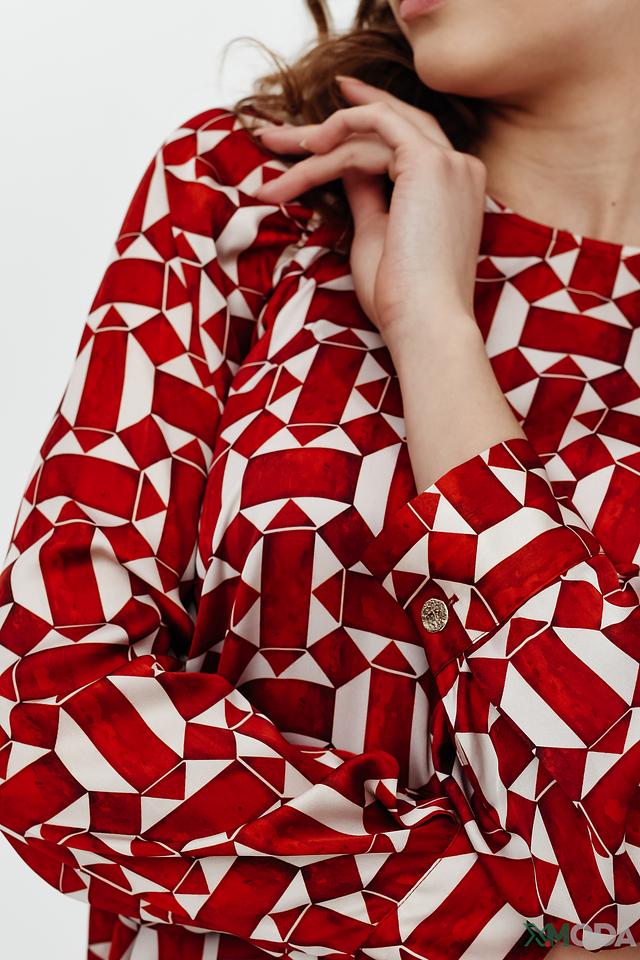 Эта элегантная блуза от Rich and Royal станет прекрасным дополнением к вашему гардеробу. Блуза выполнена в ярком красном цвете и украшена оригинальным геометрическим принтом, который придает ей неповторимый стиль.
