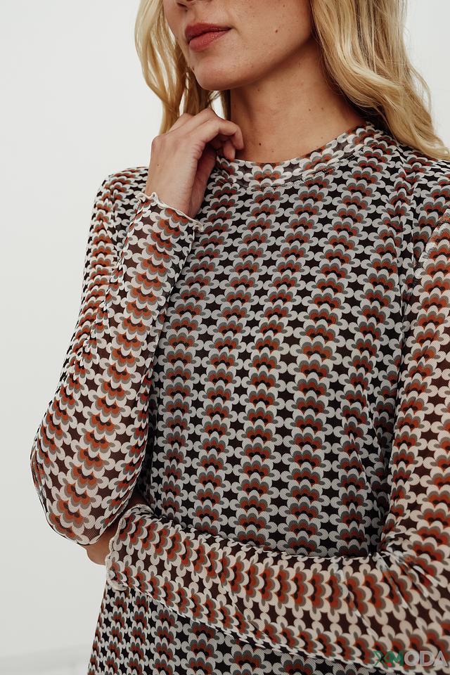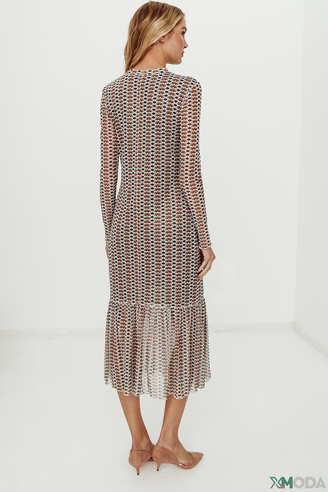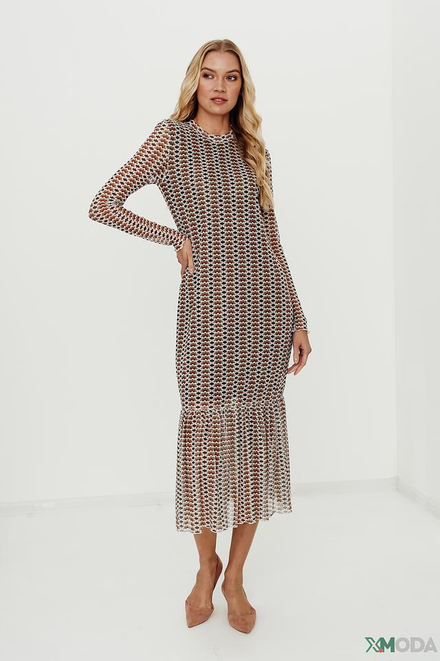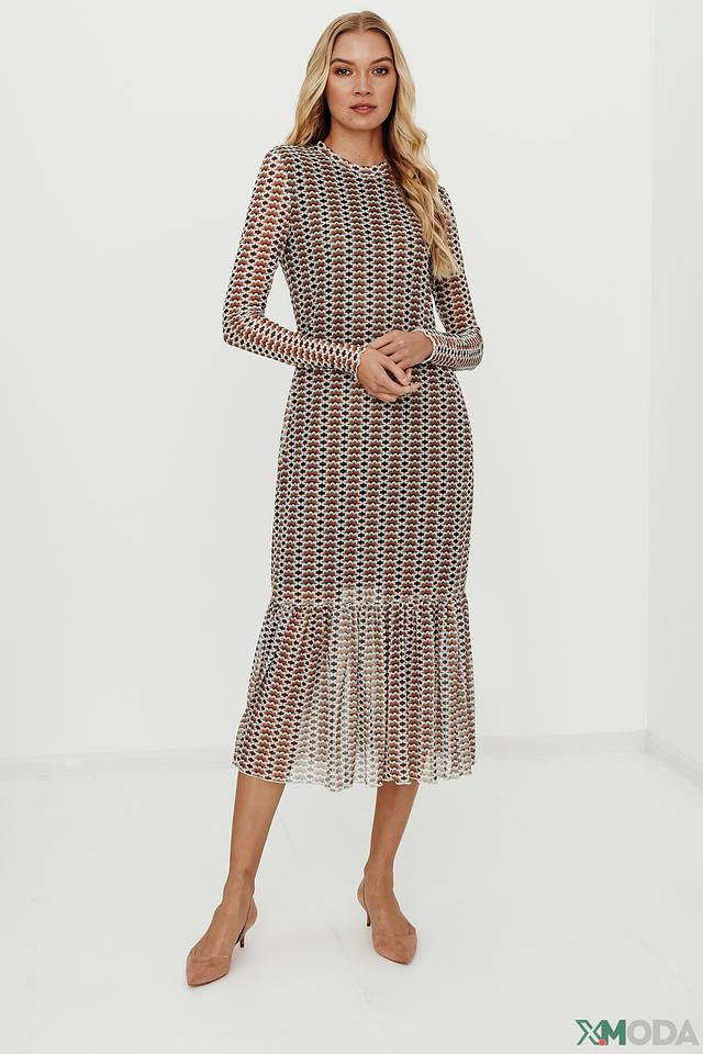 Модель имеет длину миди, длинные рукава и круглый вырез горловины. Плиссированная юбка добавляет образу легкости и динамики. Платье изготовлено из 100% полиэстера, что обеспечивает комфорт в носке и простоту ухода.